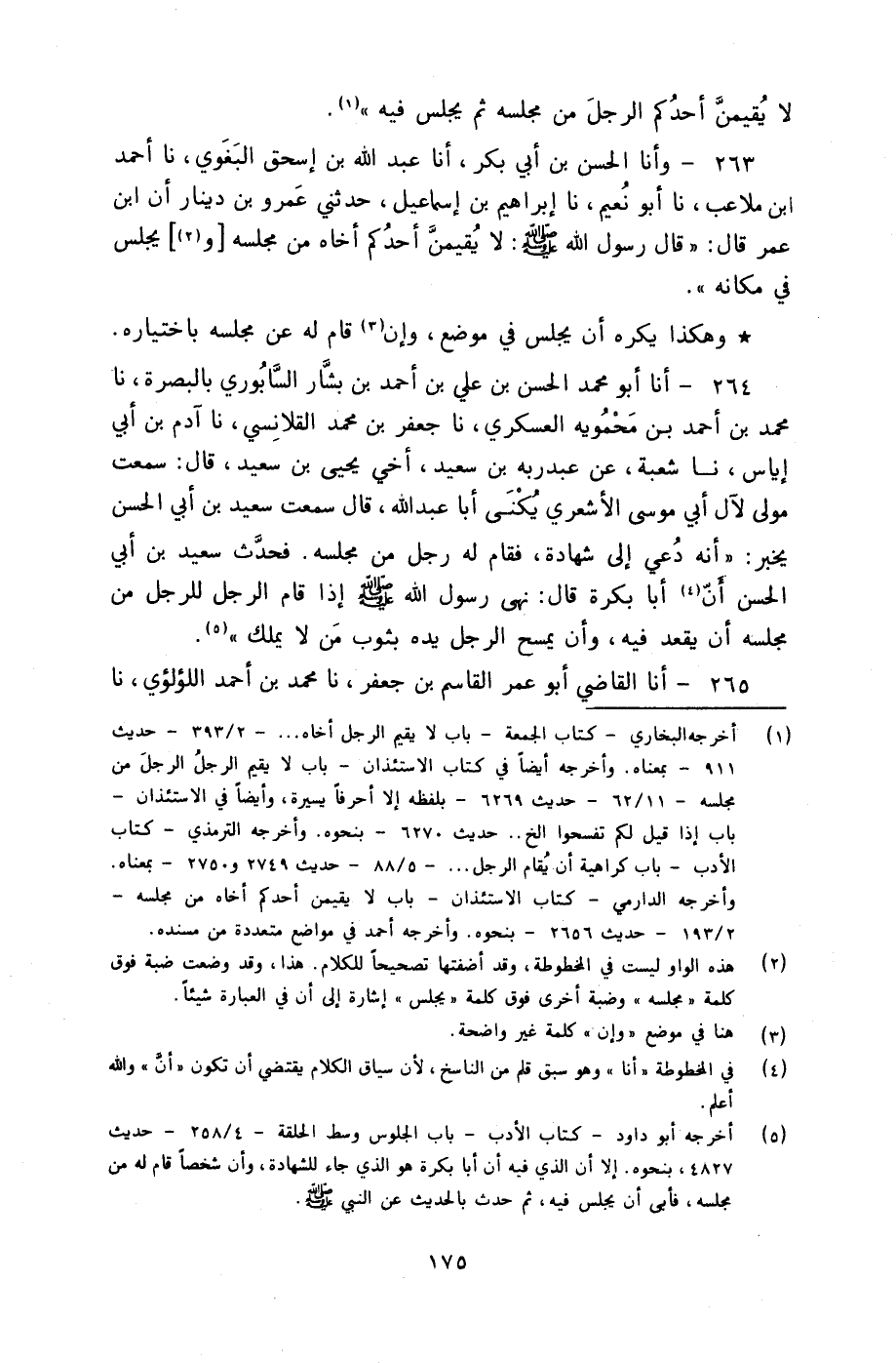 264 - أنا أَبُو مُحَمَّدٍ الْحَسَنُ بْنُ عَلِيِّ بْنِ أَحْمَدَ بْنِ بَشَّارٍ السَّابُورِيُّ، بِالْبَصْرَةِ، نا مُحَمَّدُ بْنُ أَحْمَدَ بْنِ مَحْمَوَيْهَ الْعَسْكَرِيُّ، نا جَعْفَرُ بْنُ مُحَمَّدٍ الْقَلَانِسِيُّ، نا آدَمُ بْنُ أَبِي إِيَاسَ، نا شُعْبَةُ، عَنْ عَبْدِ رَبِّهِ بْنِ سَعِيدٍ، أَخِي يَحْيَى بْنِ سَعِيدٍ قَالَ: سَمِعْتُ مَوْلًى لِآلِ أَبِي مُوسَى الْأَشْعَرِيِّ يُكْنَى أَبَا عَبْدِ اللَّهِ، قَالَ: سَمِعْتُ سَعِيدَ بْنَ أَبِي الْحَسَنِ، يُخْبِرُ أَنَّهَ دُعِيَ إِلَى شَهَادَةٍ فَقَامَ لَهُ رَجُلٌ مِنْ مَجْلِسِهِ، فَحَدَّثَ سَعِيدَ بْنَ أَبِي الْحَسَنِ أَنَّ أَبَا بَكْرَةَ قَالَ: §«نَهَى رَسُولُ اللَّهِ صَلَّى اللهُ عَلَيْهِ وَسَلَّمَ إِذَا قَامَ الرَّجُلُ لِلرَّجُلِ مِنْ مَجْلِسِهِ أَنْ يَقْعُدَ فِيهِ، وَأَنْ يَمْسَحَ الرَّجُلُ يَدَهُ بِثَوْبِ مَنْ لَا يَمْلِكُ»