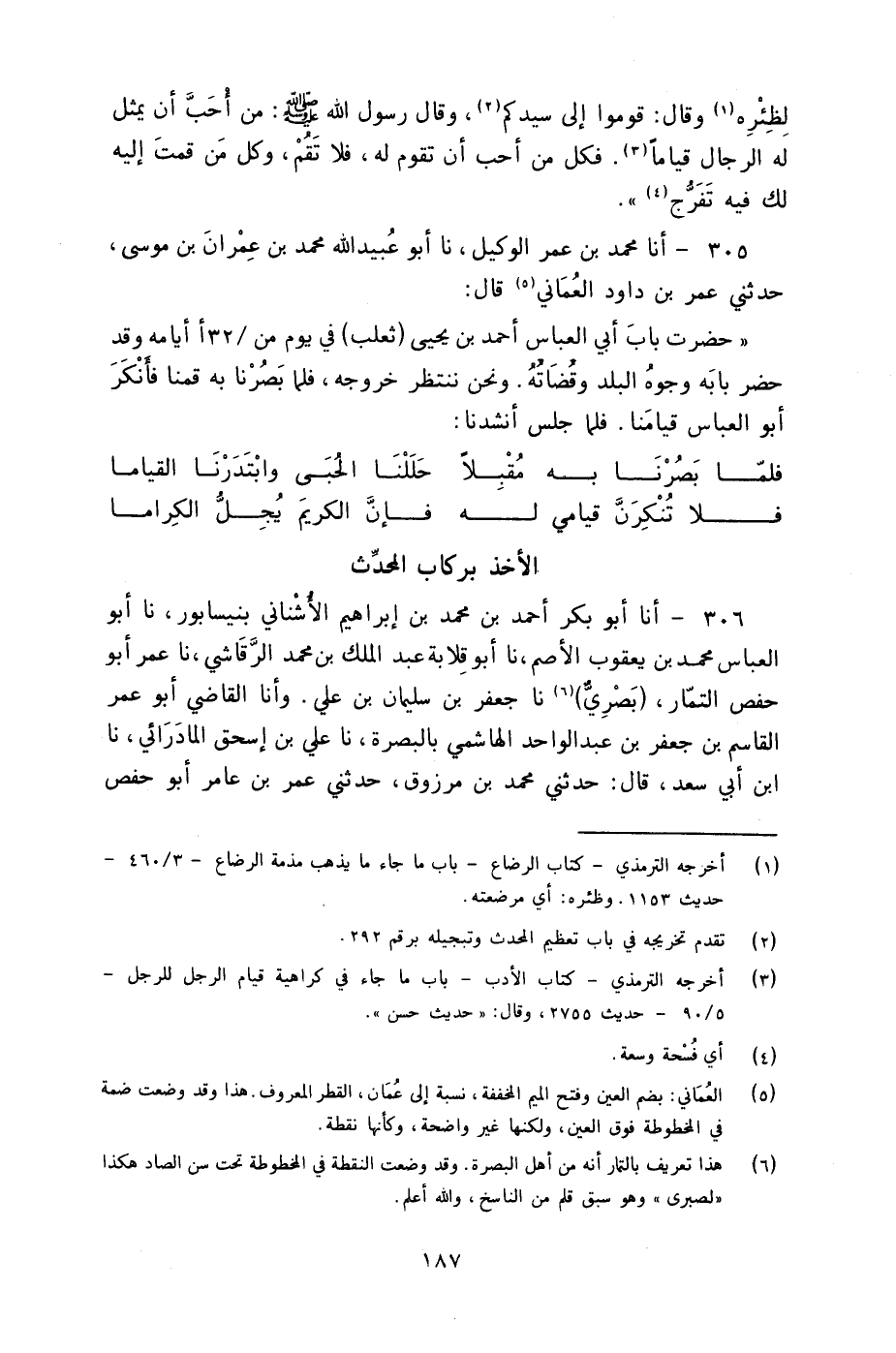 306 - أنا أَبُو بَكْرٍ أَحْمَدُ بْنُ مُحَمَّدِ بْنِ إِبْرَاهِيمَ الْأُشْنَانِيُّ بِنَيْسَابُورَ، نا أَبُو الْعَبَّاسِ مُحَمَّدُ بْنُ يَعْقُوبَ الْأَصَمُّ، نا أَبُو قِلَابَةَ عَبْدُ الْمَلِكِ بْنُ مُحَمَّدٍ الرَّقَاشِيُّ، نا عُمَرُ أَبُو حَفْصٍ التَّمَّارُ، بَصْرِيُّ، نا جَعْفَرُ بْنُ سُلَيْمَانَ بْنِ عَلِيٍّ، وأنا الْقَاضِي أَبُو عُمَرَ الْقَاسِمُ بْنُ جَعْفَرِ بْنِ عَبْدِ الْوَاحِدِ الْهَاشِمِيُّ، بِالْبَصْرَةِ، نا عَلِيُّ بْنُ إِسْحَاقَ الْمَادَرَائِيُّ، نا ابْنُ أَبِي سَعْدٍ، قَالَ: حَدَّثَنِي مُحَمَّدُ بْنُ مَرْزُوقٍ، حَدَّثَنِي عُمَرُ بْنُ عَامِرٍ أَبُو حَفْصٍ السَّعْدِيُّ، قَالَ: سَمِعْتُ جَعْفَرَ بْنَ سُلَيْمَانَ، أَمِيرَ الْبَصْرَةِ يُحَدِّثُ عَنْ أَبِيهِ، عَنْ جَدِّهِ عَلِيِّ بْنِ عَبْدِ اللَّهِ، عَنِ ابْنِ عَبَّاسٍ، قَالَ: قَالَ رَسُولُ اللَّهِ صَلَّى اللهُ عَلَيْهِ وَسَلَّمَ: §«مَنْ أَخَذَ بِرِكَابِ رَجُلٍ لَا يَرْجُوهُ وَلَا يَخَافُهُ غُفِرَ لَهُ»