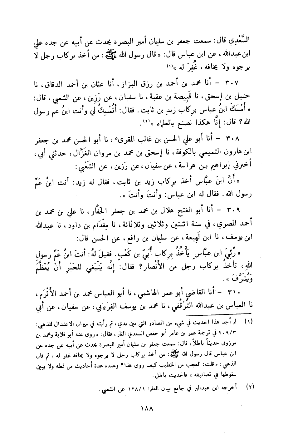 307 - أنا مُحَمَّدُ بْنُ أَحْمَدَ بْنِ رِزْقٍ الْبَزَّازُ، أنا عُثْمَانُ بْنُ أَحْمَدَ الدَّقَّاقُ، نا حَنْبَلُ بْنُ إِسْحَاقَ، نا قَبِيصَةُ بْنُ عُقْبَةَ، نا سُفْيَانُ، عَنْ رَزِينٍ، عَنِ الشَّعْبِيِّ، قَالَ: " §أَمْسَكَ ابْنُ عَبَّاسٍ بِرِكَابِ زَيْدِ بْنِ ثَابِتٍ، فَقَالَ: «أَتَمْسِكُ لِي وَأَنْتَ ابْنُ عَمِّ رَسُولِ اللَّهِ صَلَّى اللهُ عَلَيْهِ وَسَلَّمَ» ؟ قَالَ: «إِنَّا هَكَذَا نَصْنَعُ بِالْعُلَمَاءِ»