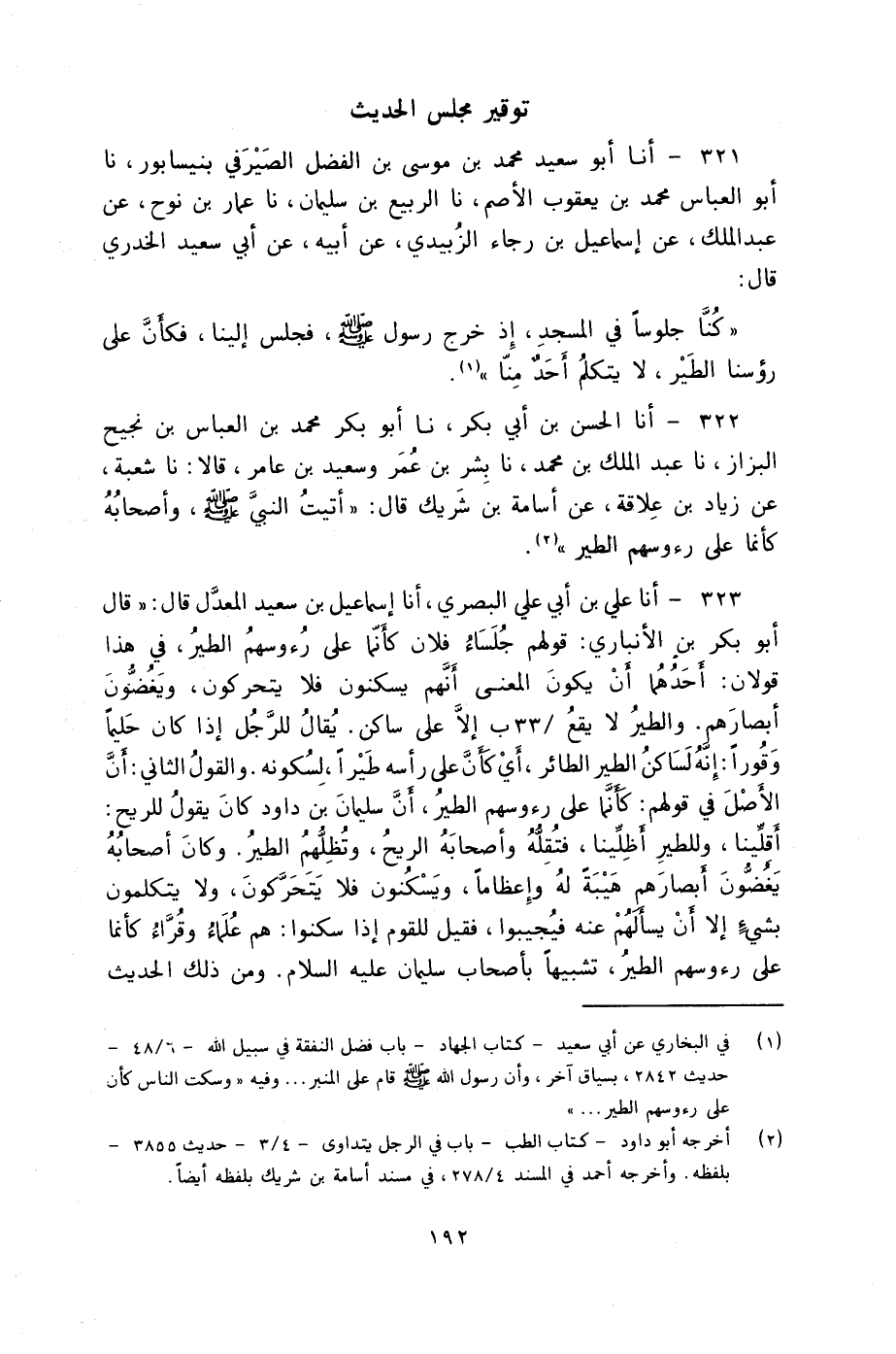 321 - أنا أَبُو سَعِيدٍ مُحَمَّدُ بْنُ مُوسَى بْنِ الْفَضْلِ الصَّيْرَفِيُّ بِنَيْسَابُورَ، نا أَبُو الْعَبَّاسِ مُحَمَّدُ بْنُ يَعْقُوبَ الْأَصَمُّ، نا الرَّبِيعُ بْنُ سُلَيْمَانَ، نا عَمَّارُ بْنُ نُوحٍ، عَنْ عَبْدِ الْمَلِكِ، عَنْ إِسْمَاعِيلَ بْنِ رَجَاءٍ الزُّبَيْدِيِّ، عَنْ أَبِيهِ، عَنْ أَبِي سَعِيدٍ الْخُدْرِيِّ، قَالَ: «§كُنَّا جُلُوسًا فِي الْمَسْجِدِ، إِذْ خَرَجَ رَسُولُ اللَّهِ صَلَّى اللهُ عَلَيْهِ وَسَلَّمَ فَجَلَسَ إِلَيْنَا، فَكَأَنَّ عَلَى رُءُوسِنَا الطَّيْرُ لَا يَتَكَلَّمُ أَحَدٌ مِنَّا»