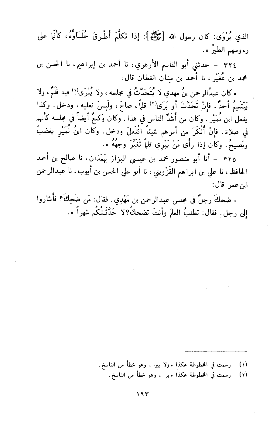 324 - حَدَّثَنِي أَبُو الْقَاسِمِ الْأَزْهَرِيُّ، نا أَحْمَدُ بْنُ إِبْرَاهِيمَ، نا الْحَسَنُ بْنُ مُحَمَّدِ بْنِ عُفَيْرٍ، نا أَحْمَدُ بْنُ سِنَانٍ الْقَطَّانُ، قَالَ: «§كَانَ عَبْدُ الرَّحْمَنِ بْنُ مَهْدِيٍّ لَا يُتَحَدَّثُ فِي مَجْلِسِهِ، وَلَا يُبْرَى فِيهِ قَلَمٌ، وَلَا يَبْتَسِمُ أَحَدٌ، فَإِنْ تَحَدَّثَ أَوْ بَرَى قَلَمَا، صَاحَ وَلَبِسَ نَعْلَيْهِ وَدَخَلَ، وَكَذَا يَفْعَلُ ابْنُ نُمَيْرٍ، وَكَانَ مِنْ أَشَدِّ النَّاسِ فِي هَذَا، وَكَانَ وَكِيعٌ أَيْضًا فِي مَجْلِسِهِ كَأَنَّهُمْ فِي صَلَاةٍ، فَإِنْ أَنْكَرَ مِنْ أَمْرِهِمْ شَيْئًا انْتَعَلَ وَدَخَلَ، وَكَانَ ابْنُ نُمَيْرٍ يَغْضَبُ وَيَصِيحُ، وَكَانَ إِذَا رَأَى مَنْ يَبْرِي قَلَمَا، تَغَيَّرَ وَجْهُهُ»