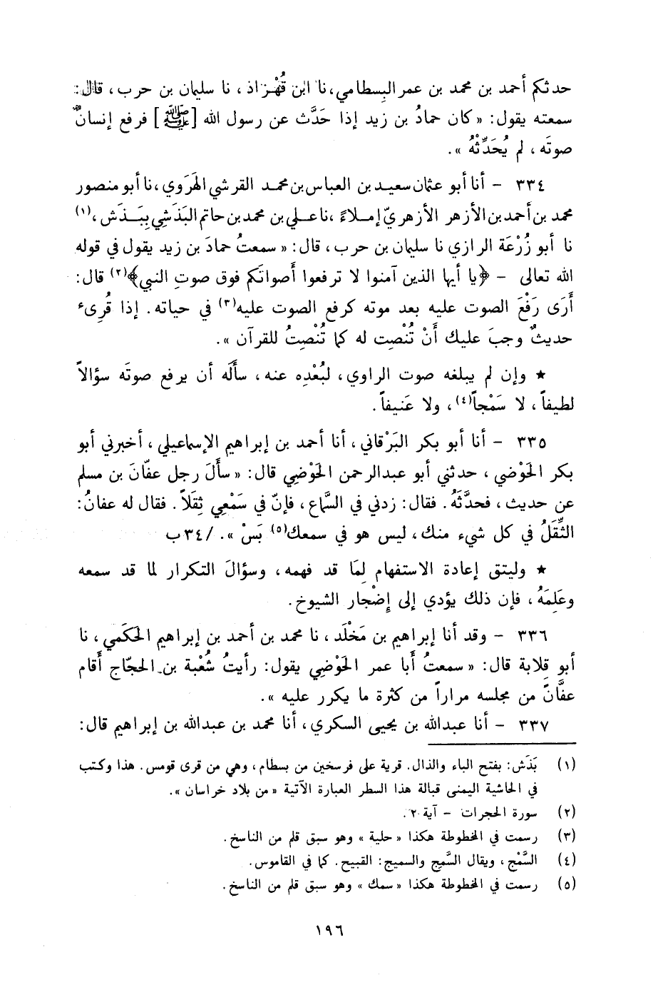 334 - أنا أَبُو عُثْمَانَ سَعِيدُ بْنُ الْعَبَّاسِ بْنِ مُحَمَّدٍ الْقُرَشِيُّ الْهَرَوِيُّ، نا أَبُو مَنْصُورٍ مُحَمَّدُ بْنُ أَحْمَدَ بْنِ الْأَزْهَرِ الْأَزْهَرِيُّ إِمْلَاءً، نا عَلِيُّ بْنُ مُحَمَّدِ بْنِ حَاتِمٍ الْبَذَشِيُّ، بِبَذَشَ، نا أَبُو زُرْعَةَ الرَّازِيُّ، نا سُلَيْمَانُ بْنُ حَرْبٍ، قَالَ: سَمِعْتُ حَمَّادَ بْنَ زَيْدٍ، يَقُولُ: فِي قَوْلِ - اللَّهِ تَعَالَى -: {يَا أَيُّهَا الَّذِينَ آمَنُوا لَا تَرْفَعُوا أَصْوَاتَكُمْ فَوْقَ صَوْتِ النَّبِيِّ} [الحجرات: 2] قَالَ: §«أَرَى رَفْعَ الصَّوْتِ عَلَيْهِ بَعْدَ مَوْتِهِ كَرَفْعِ الصَّوْتِ عَلَيْهِ فِي حَيَاتِهِ، إِذَا قُرِئَ حَدِيثٌ وَجَبَ عَلَيْكَ أَنْ تُنْصِتَ لَهُ كَمَا تُنْصِتُ لِلْقُرْآنِ» وَإِنْ لَمْ يَبْلُغْهُ صَوْتُ الرَّاوِي لِبُعْدِهِ عَنْهُ، سَأَلَهُ أَنْ يَرْفَعَ صَوْتَهُ سُؤَالًا لَطِيفًا، لَا سَمْجًا وَلَا عَنِيفًا