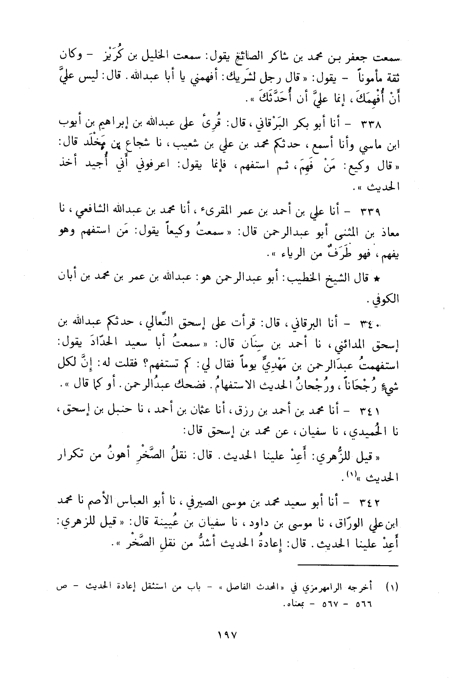 338 - أنا أَبُو بَكْرٍ الْبَرْقَانِيُّ، قَالَ: قُرِئَ عَلَى عَبْدِ اللَّهِ بْنِ إِبْرَاهِيمَ بْنِ أَيُّوبَ بْنِ مَاسِيٍّ وَأَنَا أَسْمَعُ: حَدَّثَكُمْ مُحَمَّدُ بْنُ عَلِيِّ بْنِ شُعَيْبٍ، نا شُجَاعُ بْنُ مَخْلَدٍ، قَالَ: قَالَ وَكِيعٌ: " §مَنْ فَهِمَ ثُمَّ اسْتَفْهَمَ فَإِنَّمَا يَقُولُ: اعْرَفُونِي إِنِّي أُجِيدُ أَخْذَ الْحَدِيثِ "