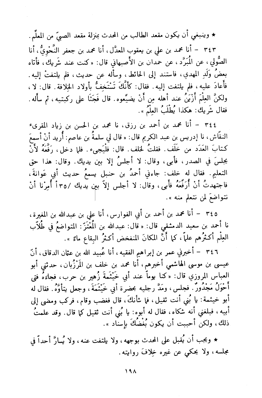 346 - أَخْبَرَنِي عُمَرُ بْنُ إِبْرَاهِيمَ الْفَقِيهُ، أنا عُبَيْدُ اللَّهِ بْنُ عُثْمَانَ الدَّقَّاقُ، أَنَّ عِيسَى بْنَ مُوسَى الْهَاشِمِيَّ، أَخْبَرَهُمْ، أنا مُحَمَّدُ بْنُ خَلَفِ بْنِ الْمَرْزُبَانِ، حَدَّثَنِي أَبُو الْعَبَّاسِ الْمَرْوَزِيُّ، قَالَ: " §كُنَّا يَوْمًا عِنْدَ أَبِي خَيْثَمَةَ زُهَيْرِ بْنِ حَرْبٍ، فَجَاءَهُ فَتًى أَحْوَلُ مَجْدُورٌ فَجَلَسَ، وَمَدَّ رِجْلَيْهِ بِحَضْرَةِ أَبِي خَيْثَمَةَ، وَجَعَلَ يَتَأَوَّهُ، فَقَالَ لَهُ أَبُو خَيْثَمَةَ: يَا بُنَيَّ، أَنْتَ ثَقِيلٌ فَمَا شَأْنُكَ؟ قَالَ: فَغَضِبَ وَقَامَ فَرَكِبَ وَمَضَى إِلَى أَبِيهِ، فَبَلَغَنِي أَنَّهُ شَكَاهُ فَقَالَ لَهُ أَبُوهُ: يَا بُنَيَّ أَنْتَ ثَقِيلٌ كَمَا قَالَ، وَقَدْ عَلِمْتُ ذَلِكَ، وَلَكِنْ أَحْبَبْتُ أَنْ يَكُونَ بُغْضُكَ بِإِسْنَادٍ " وَيَجِبُ أَنْ يُقْبِلَ عَلَى الْمُحَدِّثِ بِوَجْهِهِ، وَلَا يَلْتَفِتَ عَنْهُ، وَلَا يُسَارَّ أَحَدًا فِي مَجْلِسِهِ، وَلَا يَحْكِيَ عَنْ غَيْرِهِ خِلَافَ رِوَايَتِهِ