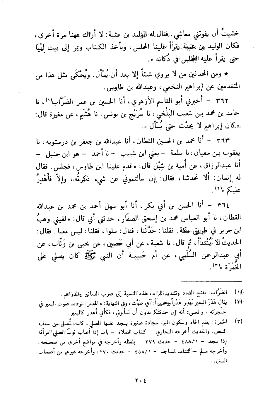 364 - أنا الْحَسَنُ بْنُ أَبِي بَكْرٍ أنا أَبُو سَهْلٍ أَحْمَدُ بْنُ مُحَمَّدِ بْنِ عَبْدِ اللَّهِ الْقَطَّانُ، نا أَبُو الْعَبَّاسِ مُحَمَّدُ بْنُ إِسْحَاقَ الصَّفَّارُ، حَدَّثَنِي أَبِي، قَالَ: لَقِيَنِي وَهْبُ بْنُ جَرِيرٍ فِي طَرِيقِ مَكَّةَ فَقُلْنَا: حَدِّثْنَا، فَقَالُ: " سَلُوا، فَقُلْنَا: لَيْسَ مَعَنَا، فَقَالَ: الْحَدِيثُ لَا يُبْتَدَأُ "، ثُمَّ قَالَ: نا شُعْبَةُ، عَنْ أَبِي حُصَيْنٍ، عَنْ يَحْيَى بْنِ وَثَّابِ، عَنْ أَبِي عَبْدِ الرَّحْمَنِ السُّلَمِيِّ، عَنْ أُمِّ حَبِيبَةَ «أَنَّ النَّبِيَّ صَلَّى اللهُ عَلَيْهِ وَسَلَّمَ كَانَ §يُصَلِّي عَلَى الْخُمْرَةِ» وَمِنْهُمْ مَنْ يِتَمَنَّعُ وَإِنْ سُئِلَ، اعْتِمَادًا عَلَى قَوْلِ شُعْبَةَ بْنِ الْحَجَّاجِ