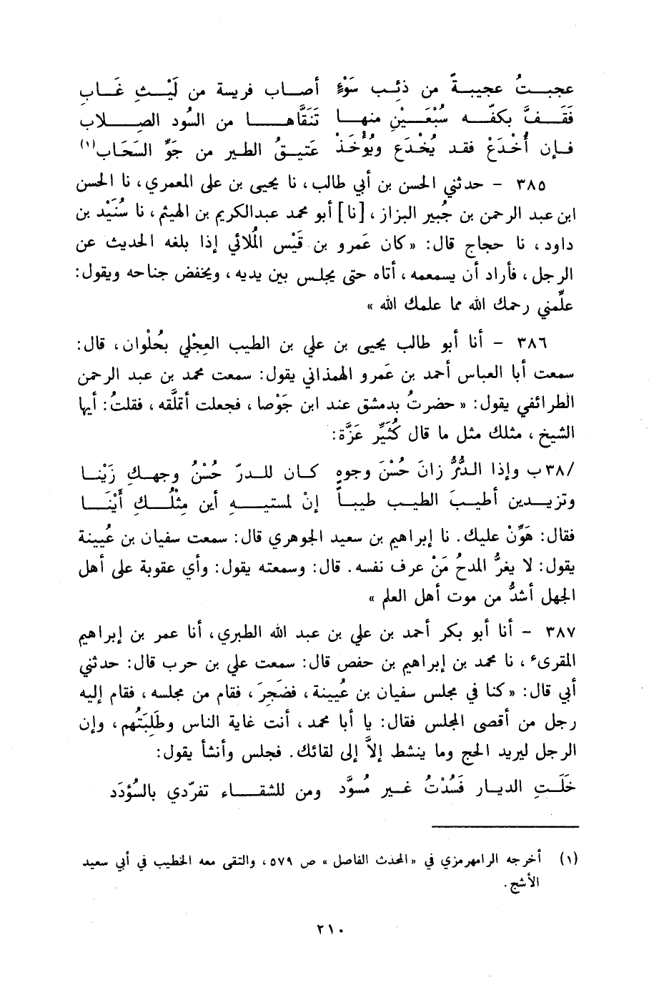 385 - حَدَّثَنِي الْحَسَنُ بْنُ أَبِي طَالِبٍ، نا يَحْيَى بْنُ عَلِيٍّ الْمَعْمَرِيُّ، نا الْحَسَنُ بْنُ عَبْدِ الرَّحْمَنِ بْنِ جُبَيْرٍ الْبَزَّازُ، نا أَبُو مُحَمَّدٍ عَبْدُ الْكَرِيمِ بْنُ الْهَيْثَمِ، نا سُنَيْدُ بْنُ دَاوُدَ، نا حَجَّاجٌ، قَالَ: كَانَ عَمْرُو بْنُ قَيْسٍ الْمُلَائِيُّ إِذَا بَلَغَهُ الْحَدِيثُ عَنِ الرَّجُلِ، فَأَرَادَ أَنْ يَسْمَعَهُ، أَتَاهُ حَتَّى يَجْلِسَ بَيْنَ يَدَيْهِ وَيَخْفِضَ جَنَاحَهُ، وَيَقُولُ: §«عَلِّمْنِي رَحِمَكَ اللَّهُ مِمَّا عَلَّمَكَ اللَّهُ»
