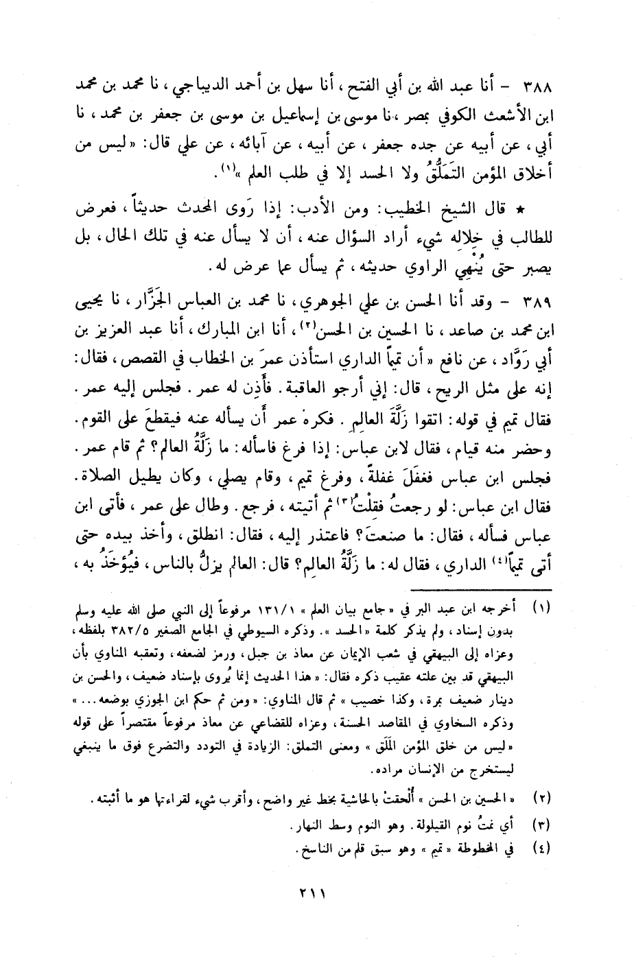388 - أنا عَبْدُ اللَّهِ بْنُ أَبِي الْفَتْحِ، أنا سَهْلُ بْنُ أَحْمَدَ الدِّيبَاجِيُّ، نا مُحَمَّدُ بْنُ مُحَمَّدِ بْنِ الْأَشْعَثِ الْكُوفِيُّ، بِمِصْرَ، نا مُوسَى بْنُ إِسْمَاعِيلَ بْنِ مُوسَى بْنِ جَعْفَرِ بْنِ مُحَمَّدٍ، نا أَبِي، عَنْ أَبِيهِ، عَنْ جَدِّهِ جَعْفَرٍ، عَنْ أَبِيهِ، عَنْ آبَائِهِ، عَنْ عَلِيٍّ، قَالَ: «§لَيْسَ مِنْ أَخْلَاقِ الْمُؤْمِنِ التَّمَلُّقُ، وَلَا الْحَسَدُ، إِلَّا فِي طَلَبِ الْعِلْمِ» قَالَ الشَّيْخُ الْخَطِيبُ: وَمِنَ الْأَدَبِ إِذَا رَوَى الْمُحَدِّثُ حَدِيثًا، فَعَرَضَ لِلطَّالِبِ فِي خِلَالِهِ شَيْءٌ أَرَادَ السُّؤَالَ عَنْهُ، أَنْ لَا يَسْأَلَ عَنْهُ فِي تِلْكَ الْحَالِ، بَلْ يَصْبِرُ حَتَّى يُنْهِيَ الرَّاوِي حَدِيثَهُ، ثُمَّ يَسْأَلَ عَمَّا عَرَضَ لَهُ