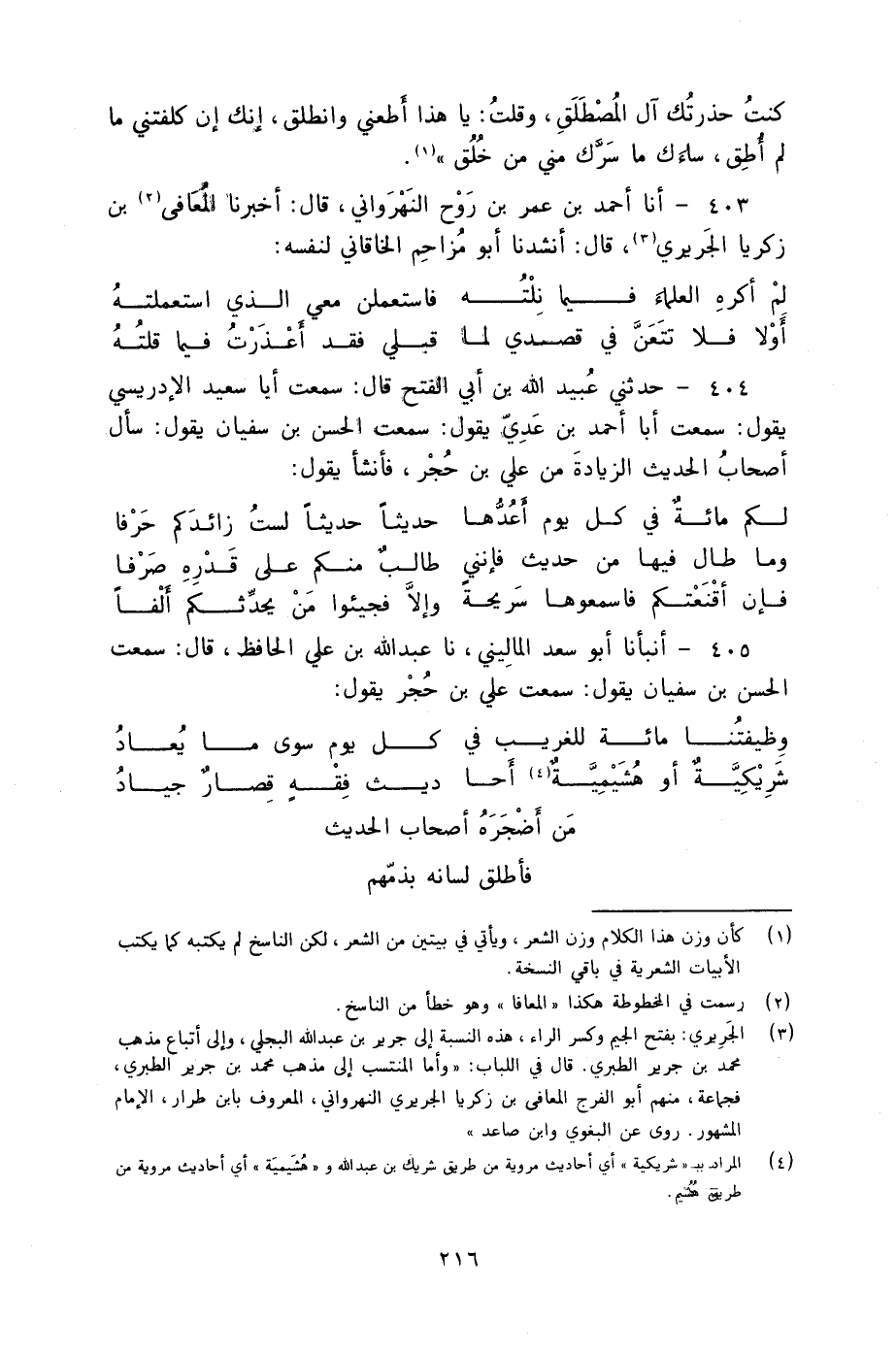 404 - حَدَّثَنِي عُبَيْدُ اللَّهِ بْنُ أَبِي الْفَتْحِ، قَالَ: سَمِعْتُ أَبَا سَعِيدٍ الْإِدْرِيسِيَّ، يَقُولُ: سَمِعْتُ أَبَا أَحْمَدَ بْنَ عَدِيٍّ، يَقُولُ: سَمِعْتُ الْحَسَنَ بْنَ سُفْيَانَ، يَقُولُ: " سَأَلَ أَصْحَابُ الْحَدِيثِ الزِّيَادَةَ مِنْ عَلِيِّ بْنِ حُجْرٍ، فَأَنْشَأَ يَقُولُ: