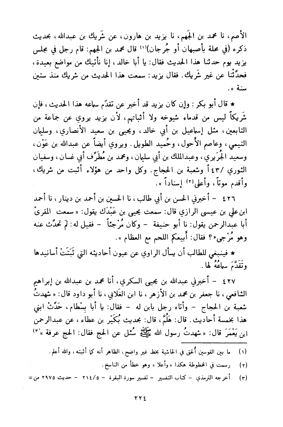 426 - أَخْبَرَنِي الْحَسَنُ بْنُ أَبِي طَالِبٍ، نا الْحُسَيْنُ بْنُ أَحْمَدَ بْنِ دِينَارٍ، نا أَحْمَدُ بْنُ عَلِيِّ بْنِ عِيسَى الرَّازِيُّ، قَالَ: سَمِعْتُ يَحْيَى بْنَ عَبْدَكٍ، يَقُولُ: سَمِعْتُ الْمُقْرِئَ أَبَا عَبْدِ الرَّحْمَنِ، يَقُولُ: " §نا أَبُو حَنِيفَةَ - وَكَانَ مُرْجِئًا - فَقِيلَ لَهُ: لِمَ تُحَدِّثُ عَنْهُ وَهُوَ مُرْجِئٌ؟ فَقَالَ: أَبِيعُكُمُ اللَّحْمَ مَعَ الْعِظَامِ " فَيَنْبَغِي لِلطَّالِبِ أَنْ يَسْأَلَ الرَّاوِيَ عَنْ عُيُونِ أَحَادِيثِهِ الَّتِي ثَبَتَتْ أَسَانِيدُهَا، وَتَقَدَّمَ سَمَاعُهُ لَهَا
