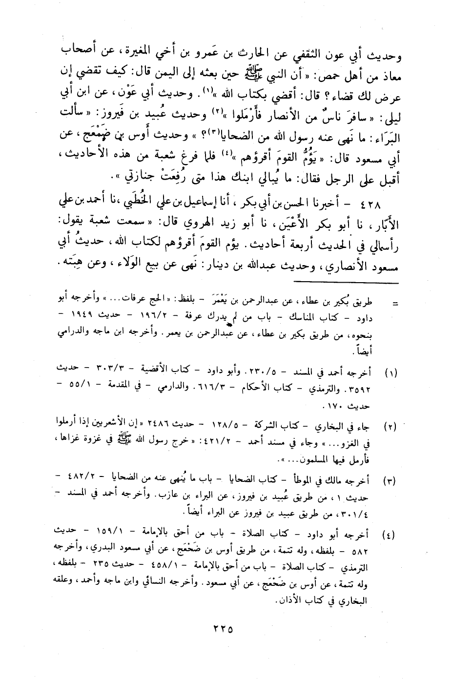 428 - أَخْبَرَنَا الْحَسَنُ بْنُ أَبِي بَكْرٍ أنا إِسْمَاعِيلُ بْنُ عَلِيٍّ الْخُطَبِيُّ، نا أَحْمَدُ بْنُ عَلِيٍّ الْأَبَّارُ، نا أَبُو بَكْرٍ الْأَعْيَنُ، نا أَبُو زَيْدٍ الْهَرَوِيُّ، قَالَ: سَمِعْتُ شُعْبَةَ، يَقُولُ: " §رَأَسِمَالِي فِي الْحَدِيثِ أَرْبَعَةُ أَحَادِيثَ: «يَؤُمُّ الْقَوْمَ أَقْرَؤُهُمْ لِكِتَابِ اللَّهِ» ، حَدِيثُ أَبِي مَسْعُودٍ الْأَنْصَارِيِّ، وَحَدِيثُ عَبْدِ اللَّهِ بْنِ دِينَارٍ: «نَهَى عَنْ بَيْعِ الْوَلَاءِ، وَعَنْ هِبَتِهِ» ، وَحَدِيثُ الْبَرَاءِ فِي الْأَضَاحِي، قَالَ أَبُو زَيْدٍ: «وَنَسِيتُ الرَّابِعَ»