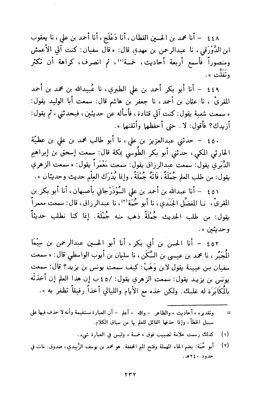 448 - أنا مُحَمَّدُ بْنُ الْحُسَيْنِ الْقَطَّانُ، أنا دَعْلَجٌ، أنا أَحْمَدُ بْنُ عَلِيٍّ، نا يَعْقُوبُ بْنُ الدَّوْرَقِيِّ، نا عَبْدُ الرَّحْمَنِ بْنُ مَهْدِيٍّ، قَالَ، قَالَ سُفْيَانُ: «§كُنْتُ آتِي الْأَعْمَشَ وَمَنْصُورًا، فَأَسْمَعُ أَرْبَعَةَ أَحَادِيثَ، خَمْسَةً ثُمَّ أَنْصَرِفُ، كَرَاهَةَ أَنْ تَكْثُرَ وَتَفْلِتَ»