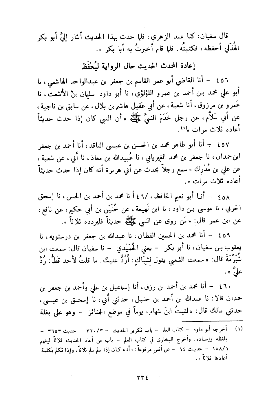 457 - أنا أَبُو طَاهِرٍ مُحَمَّدُ بْنُ الْحَسَنِ بْنِ عِيسَى النَّاقِدُ، أنا أَحْمَدُ بْنُ جَعْفَرِ بْنِ حَمْدَانَ، نا جَعْفَرُ بْنُ مُحَمَّدٍ الْفِيرْيَابِيُّ، نا عُبَيْدُ اللَّهِ بْنُ مُعَاذٍ، نا أَبِي، عَنْ شُعْبَةَ، عَنْ عَلِيِّ بْنِ مُدْرِكٍ، سَمِعَ رَجُلًا، يُحَدِّثُ عَنْ أَبِي هُرَيْرَةَ، أَنَّهُ §«كَانَ إِذَا حَدَّثَ حَدِيثًا أَعَادَهُ ثَلَاثَ مَرَّاتٍ»
