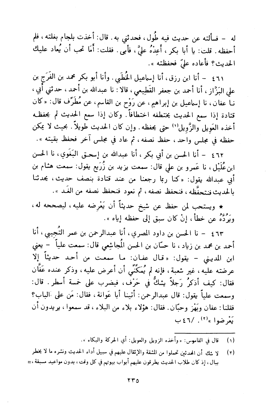 461 - أنا ابْنُ رِزْقٍ، أنا إِسْمَاعِيلُ الْخُطَبِيُّ، وأنا أَبُو بَكْرٍ مُحَمَّدُ بْنُ الْفَرَجِ بْنِ عَلِيٍّ الْبَزَّازُ، أنا أَحْمَدُ بْنُ جَعْفَرٍ الْقَطِيعِيُّ، قَالَا: نا عَبْدُ اللَّهِ بْنُ أَحْمَدَ، حَدَّثَنِي أَبِي، نا عَفَّانُ، نا إِسْمَاعِيلُ بْنُ إِبْرَاهِيمَ، عَنْ رَوْحِ بْنِ الْقَاسِمِ، عَنْ مُطَرِّفٍ، قَالَ: «§كَانَ قَتَادَةُ إِذَا سَمِعَ الْحَدِيثَ يَخْتَطِفُهُ اخْتِطَافًا، وَكَانَ إِذَا سَمِعَ الْحَدِيثَ لَمْ يَحْفَظْهُ أَخَذَهُ الْعَوِيلُ وَالزَّوِيلُ حَتَّى يَحْفَظَهُ» وَإِنْ كَانَ الْحَدِيثُ طَوِيلًا، بِحَيْثُ لَا يُمْكِنُ حِفْظُهُ فِي مَجْلِسٍ وَاحِدٍ، حَفِظَ نِصْفَهُ ثُمَّ عَادَ فِي مَجْلِسٍ آخَرَ فَحَفِظَ بَقِيَّتَهُ