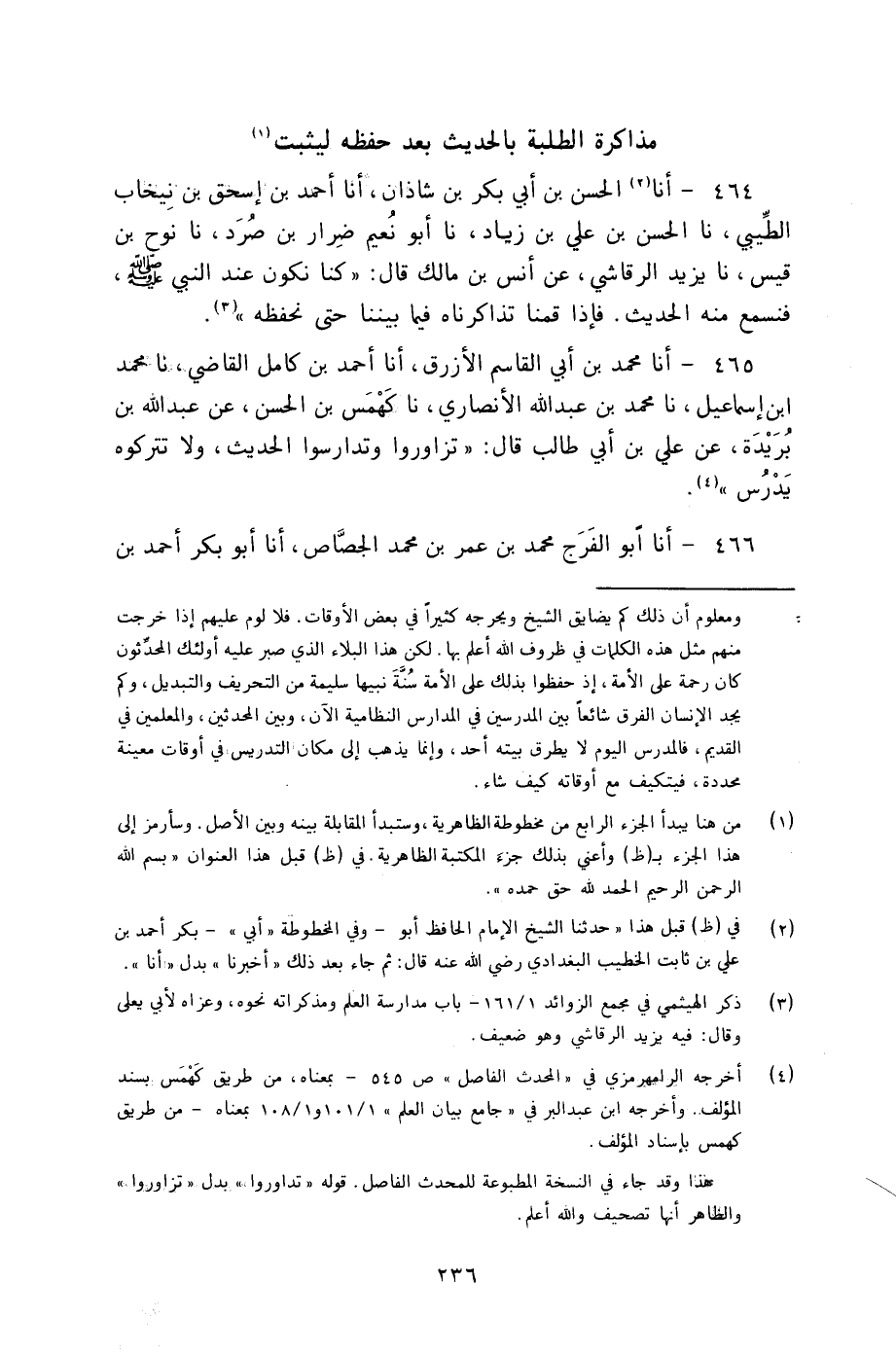 464 - أنا الْحَسَنُ بْنُ أَبِي بَكْرِ بْنِ شَاذَانَ، أنا أَحْمَدُ بْنُ إِسْحَاقَ بْنِ نِيخَابٍ الطِّيبِيُّ، نا الْحَسَنُ بْنُ عَلِيِّ بْنِ زِيَادٍ، نا أَبُو نُعَيْمٍ ضِرَارُ بْنُ صُرَدٍ، نا نُوحُ بْنُ قَيْسٍ، نا يَزِيدُ الرَّقَاشِيُّ، عَنْ أَنَسِ بْنِ مَالِكٍ، قَالَ: §«كُنَّا نَكُونُ عِنْدَ النَّبِيِّ صَلَّى اللهُ عَلَيْهِ وَسَلَّمَ فَنَسْمَعُ مِنْهُ الْحَدِيثَ، فَإِذَا قُمْنَا تَذَاكَرْنَاهُ فِيمَا بَيْنَنَا حَتَّى نَحْفَظَهُ»