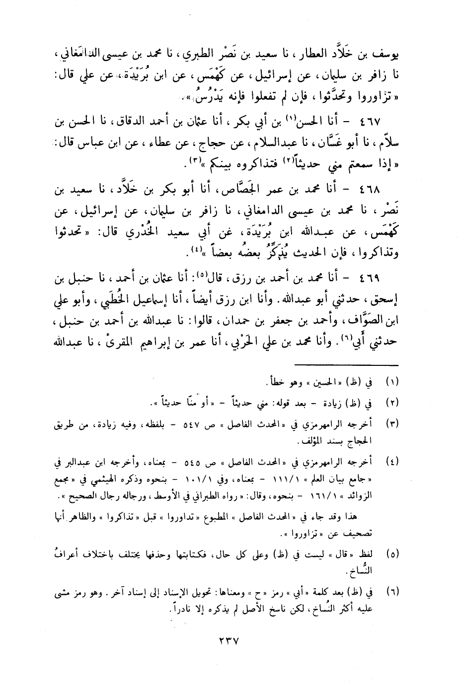 467 - أنا الْحَسَنُ بْنُ أَبِي بَكْرٍ أنا عُثْمَانُ بْنُ أَحْمَدَ الدَّقَّاقُ، نا الْحَسَنُ بْنُ سَلَّامٍ، نا أَبُو غَسَّانَ، نا عَبْدُ السَّلَامِ، عَنْ حَجَّاجٍ، عَنْ عَطَاءٍ، عَنِ ابْنِ عَبَّاسٍ، قَالَ: §«إِذَا سَمِعْتُمْ مِنِّي حَدِيثًا فَتَذَاكَرُوهُ بَيْنَكُمْ»
