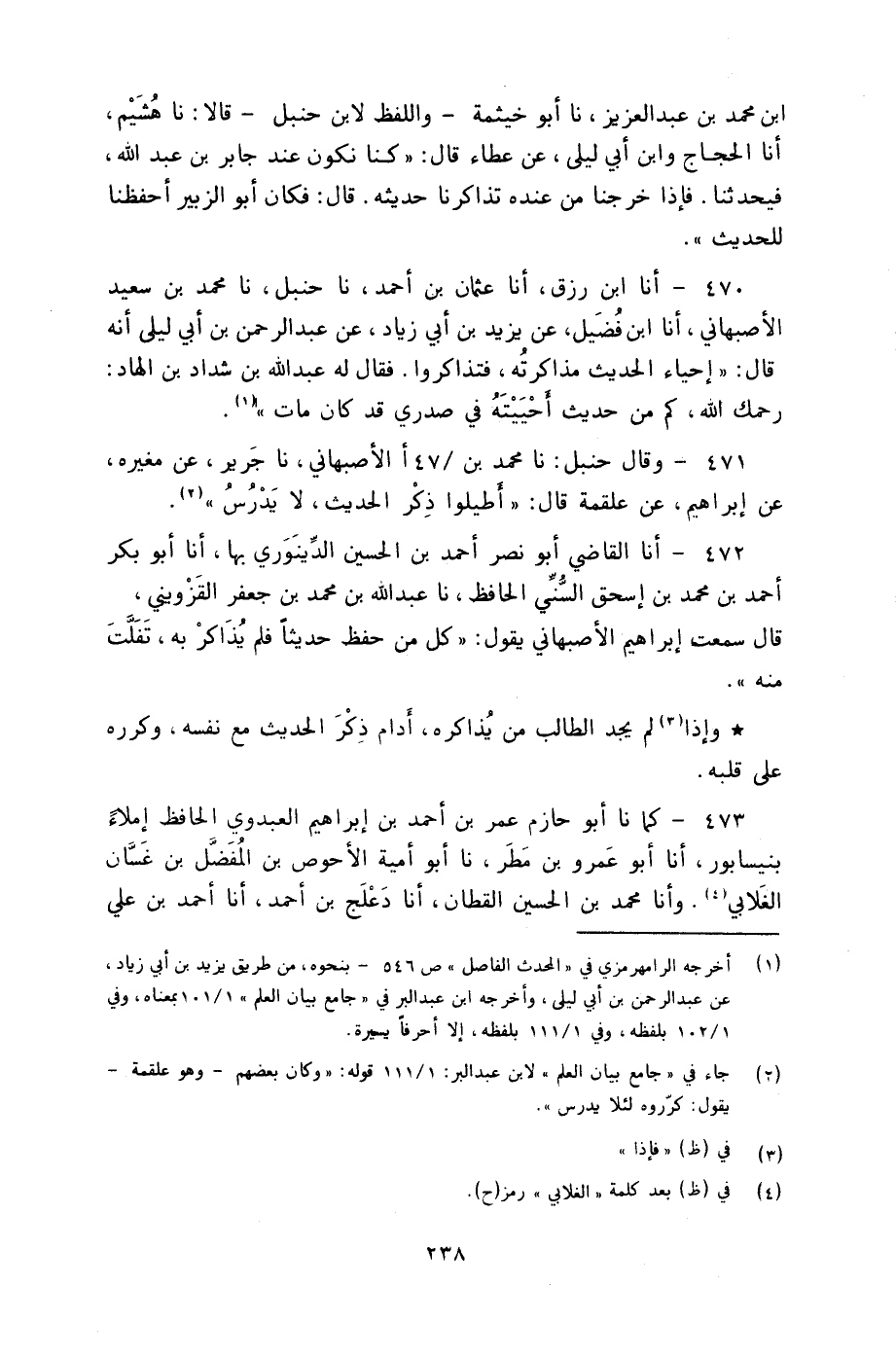473 - كَمَا نا أَبُو حَازِمٍ عُمَرُ بْنُ أَحْمَدَ بْنِ إِبْرَاهِيمَ الْعَبْدَوِيُّ الْحَافِظُ إِمْلَاءً بِنَيْسَابُورَ، أنا أَبُو عَمْرِو بْنُ مَطَرٍ، نا أَبُو أُمَيَّةَ الْأَحْوَصُ بْنُ الْمُفَضَّلِ بْنِ غَسَّانَ الْغَلَابِيُّ، وأنا مُحَمَّدُ بْنُ الْحُسَيْنِ الْقَطَّانُ، أنا دَعْلَجُ بْنُ أَحْمَدَ، أنا أَحْمَدُ بْنُ عَلِيٍّ -[239]- الْأَبَّارُ، قَالَا: نا إِبْرَاهِيمُ بْنُ سَعِيدٍ، قَالَ: سَمِعْتُ مُعَاذَ بْنَ مُعَاذٍ، يَقُولُ: " §كُنَّا بِبَابِ ابْنِ عَوْنٍ، فَخَرَجَ عَلَيْنَا شُعْبَةُ وَقَدْ عَقَدَ بِيَدَيْهِ جَمِيعًا فَكَلَّمَهُ بَعْضُنَا، فَقَالَ: «لَا تُكَلِّمْنِي فَإِنِّي قَدْ حَفِظْتُ عَنِ ابْنِ عَوْنٍ عَشَرَةَ أَحَادِيثَ أَخَافُ أَنْ أَنْسَاهَا» وَإِذَا رَوَى الْمُحَدِّثُ حَدِيثًا طَوِيلًا فَلَمْ يَقُمِ الطَّالِبُ بِحِفْظِهِ، وَسَأَلَ الْمُحَدِّثَ أَنْ يُمْلِيَهُ عَلَيْهِ أَوْ يُعِيرَهُ كِتَابَهُ لِيَنْقُلَهُ مِنْهُ وَيَحْفَظَهُ بَعْدُ مِنْ نُسْخَتِهِ، فَلَا بَأْسَ بِذَلِكَ