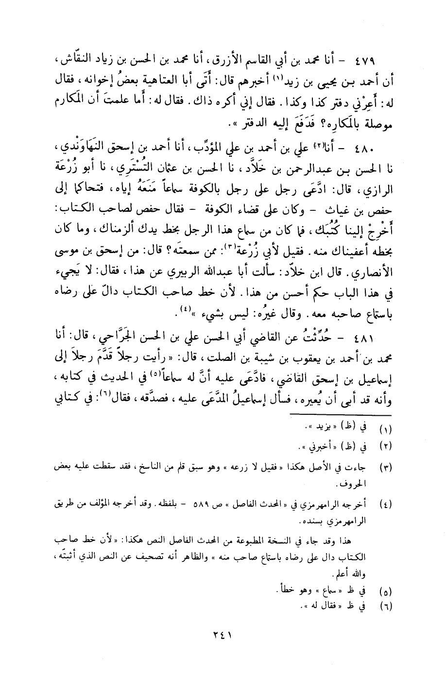 480 - أنا عَلِيُّ بْنُ أَحْمَدَ بْنِ عَلِيٍّ الْمُؤَدِّبُ، أنا أَحْمَدُ بْنُ إِسْحَاقَ النَّهَاوَنْدِيُّ، نا الْحَسَنُ بْنُ عَبْدِ الرَّحْمَنِ بْنِ خَلَّادٍ، نا الْحَسَنُ بْنُ عُثْمَانَ التُّسْتَرِيُّ، نا أَبُو زُرْعَةَ الرَّازِيُّ، قَالَ: " §ادَّعَى رَجُلٌ عَلَى رَجُلٍ بِالْكُوفَةِ سَمَاعًا مَنَعَهُ إِيَّاهُ، فَتَحَاكَمَا إِلَى حَفْصِ بْنِ غِيَاثٍ، وَكَانَ عَلَى قَضَاءِ الْكُوفَةِ فَقَالَ حَفْصٌ: " لِصَاحِبِ الْكِتَابِ: أَخْرِجْ إِلَيْنَا كُتُبَكَ، فَمَا كَانَ مِنْ سَمَاعِ هَذَا الرَّجُلِ بِخَطِّ يَدِكَ أَلْزَمْنَاكَ، وَمَا كَانَ بِخَطِّهِ أَعْفَيْنَاكَ مِنْهُ "، فَقِيلَ لِأَبِي زُرْعَةَ: مِمَّنْ سَمِعْتَهُ؟ قَالَ: مِنْ إِسْحَاقَ بْنِ مُوسَى الْأَنْصَارِيِّ، قَالَ ابْنُ خَلَّادٍ: سَأَلْتُ أَبَا عَبْدِ اللَّهِ الزُّبَيْرِيَّ عَنْ هَذَا، فَقَالَ: لَا يَجِيءُ فِي هَذَا الْبَابِ حُكْمٌ أَحْسَنُ مِنْ هَذَا؛ لِأَنَّ خَطَّ صَاحِبِ الْكِتَابِ دَالٌّ عَلَى رِضَاهُ بِاسْتِمَاعِ صَاحِبِهِ مَعَهُ، وَقَالَ غَيْرُهُ: لَيْسَ بِشَيْءٍ "