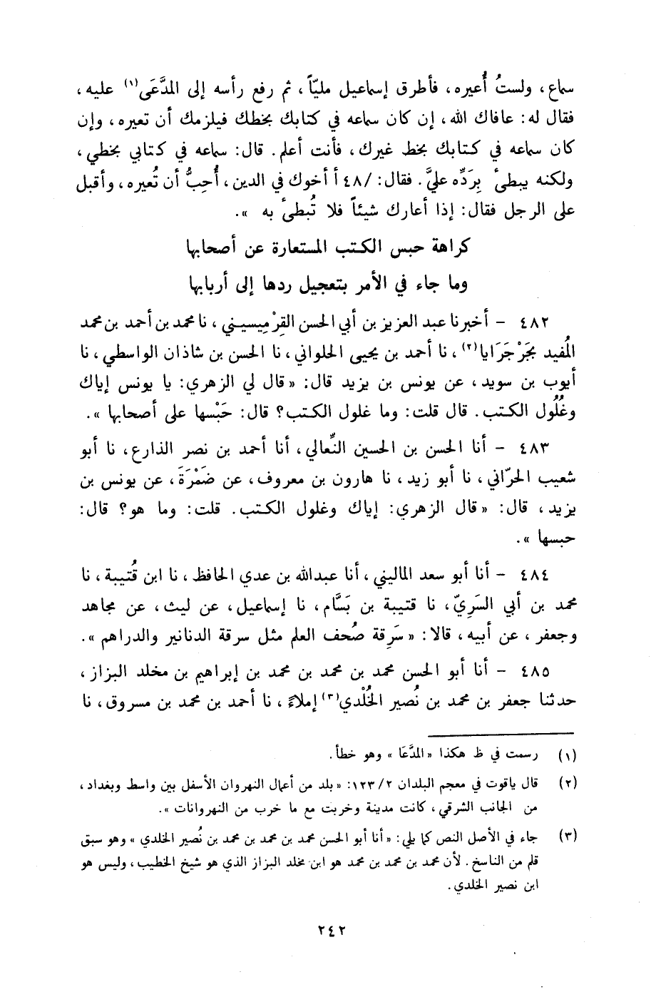 482 - أَخْبَرَنَا عَبْدُ الْعَزِيزِ بْنُ أَبِي الْحَسَنِ الْقِرْمِيسِينِيُّ، نا مُحَمَّدُ بْنُ أَحْمَدَ بْنِ مُحَمَّدٍ الْمُفِيدُ، بِجَرْجَرَايَا، نا أَحْمَدُ بْنُ يَحْيَى الْحُلْوَانِيُّ، نا الْحَسَنُ بْنُ شَاذَانَ الْوَاسِطِيُّ، نا أَيُّوبُ بْنُ سُوَيْدٍ، عَنْ يُونُسَ بْنِ يَزِيدَ، قَالَ: قَالَ لِي الزُّهْرِيُّ: " يَا يُونُسُ §إِيَّاكَ وَغُلُولَ الْكُتُبِ قَالَ: قُلْتُ: وَمَا غُلُولُ الْكُتُبِ؟ قَالَ: «حَبْسُهَا عَلَى أَصْحَابِهَا»