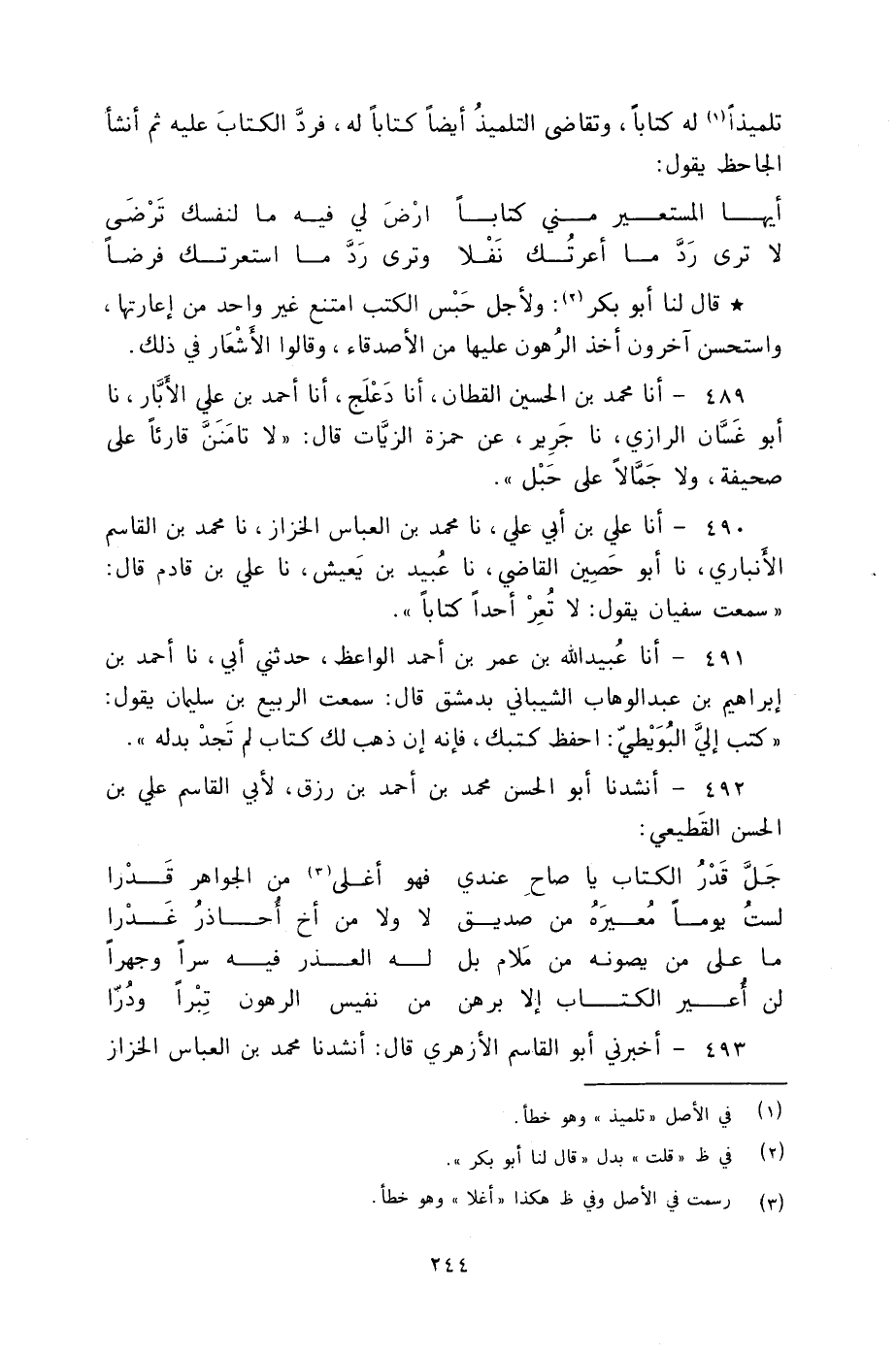491 - أنا عُبَيْدُ اللَّهِ بْنُ عُمَرَ بْنِ أَحْمَدَ الْوَاعِظُ، حَدَّثَنِي أَبِي، نا أَحْمَدُ بْنُ إِبْرَاهِيمَ بْنِ عَبْدِ الْوَهَّابِ الشَّيْبَانِيُّ، بِدِمَشْقَ قَالَ: سَمِعْتُ الرَّبِيعَ بْنَ سُلَيْمَانَ، يَقُولُ: كَتَبَ إِلَيَّ الْبُوَيْطِيُّ: «§احْفَظْ كُتُبَكَ، فَإِنَّهُ إِنْ ذَهَبَ لَكَ كِتَابٌ لَمْ تَجِدْ بَدَلَهُ»