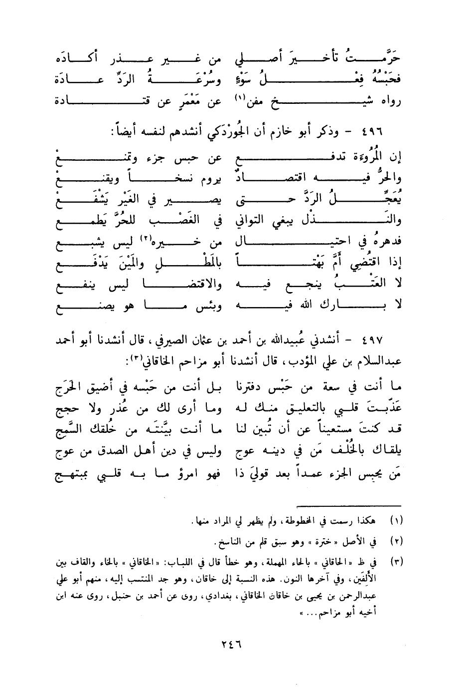 497 - أَنْشِدْنِي عُبَيْدُ اللَّهِ بْنُ أَحْمَدَ بْنِ عُثْمَانَ الصَّيْرَفِيُّ، قَالَ: أَنْشَدَنَا أَبُو أَحْمَدَ عَبْدُ السَّلَامِ بْنُ عَلِيٍّ الْمُؤَدِّبُ، قَالَ: أَنْشَدَنَا أَبُو مُزَاحِمٍ الْخَاقَانِيُّ:
