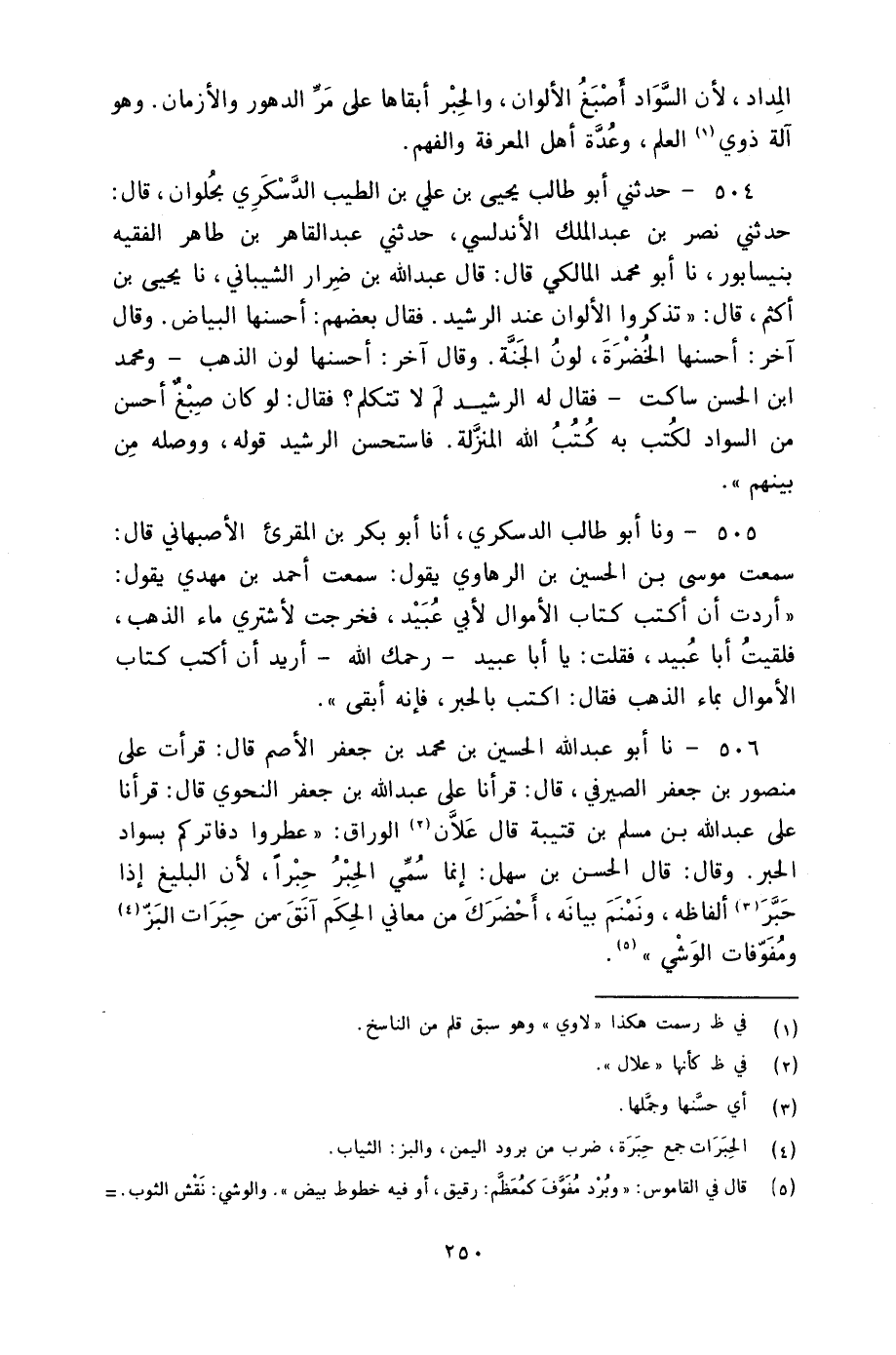 505 - وَنا أَبُو طَالِبٍ الدَّسْكَرِيُّ، أنا أَبُو بَكْرِ بْنُ الْمُقْرِئِ الْأَصْبَهَانِيُّ، قَالَ سَمِعْتُ مُوسَى بْنَ الْحُسَيْنِ بْنِ الرَّهَاوِيِّ، يَقُولُ: سَمِعْتُ أَحْمَدَ بْنَ مَهْدِيٍّ، يَقُولُ: " §أَرَدْتُ أَنْ أَكْتُبَ كِتَابَ الْأَمْوَالِ لِأَبِي عُبَيْدٍ، فَخَرَجْتُ لِأَشْتَرِيَ مَاءَ الذَّهَبِ، فَلَقِيتُ أَبَا عُبَيْدٍ فَقُلْتُ: يَا أَبَا عُبَيْدٍ، رَحِمَكَ اللَّهُ، أُرِيدُ أَنْ أَكْتُبَ كِتَابَ الْأَمْوَالِ بِمَاءِ الذَّهَبِ، فَقَالَ: «اكْتُبْ بِالْحِبْرِ فَإِنَّهُ أَبْقَى»