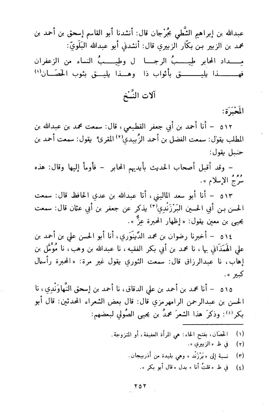 512 - أنا أَحْمَدُ بْنُ أَبِي جَعْفَرٍ الْقَطِيعِيُّ، قَالَ: سَمِعْتُ مُحَمَّدَ بْنَ عَبْدِ اللَّهِ بْنِ الْمُطَّلِبِ، يَقُولُ: سَمِعْتُ الْفَضْلَ بْنَ أَحْمَدَ الزُّبَيْدِيَّ الْمُقْرِئَ، يَقُولُ: سَمِعْتُ أَحْمَدَ بْنَ حَنْبَلٍ، يَقُولُ، وَقَدْ أَقْبَلَ أَصْحَابُ الْحَدِيثِ بِأَيْدِيهِمُ الْمَحَابِرُ، فَأَوْمَأَ إِلَيْهَا وَقَالَ: §«هَذِهِ سَرْجُ الْإِسْلَامِ»