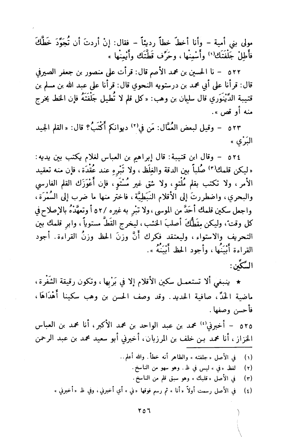 522 - نا الْحُسَيْنُ بْنُ مُحَمَّدٍ الْأَصَمُّ، قَالَ: قَرَأْتُ عَلَى مَنْصُورِ بْنِ جَعْفَرٍ الصَّيْرَفِيِّ، قَالَ: قَرَأْنَا عَلَى أَبِي مُحَمَّدِ بْنِ دُرُسْتَوَيْهِ النَّحْوِيِّ قَالَ: قَرَأْنَا عَلَى عَبْدِ اللَّهِ بْنِ مُسْلِمِ بْنِ قُتَيْبَةَ الدِّينَوَرِيِّ، قَالَ سُلَيْمَانُ بْنُ وَهْبٍ: §«كُلُّ قَلَمٍ لَا تُطِيلُ جَلْفَتَهُ فَإِنَّ الْخَطَّ يَخْرُجُ مِنْهُ أَوْقَصَ» وَقِيلَ لِبَعْضِ الْعُمَّالِ: مَنْ فِي دِيوَانِكُمْ أَكْتَبُ؟ قَالَ: الْقَلَمُ الْجَيِّدُ الْبَرْيِ