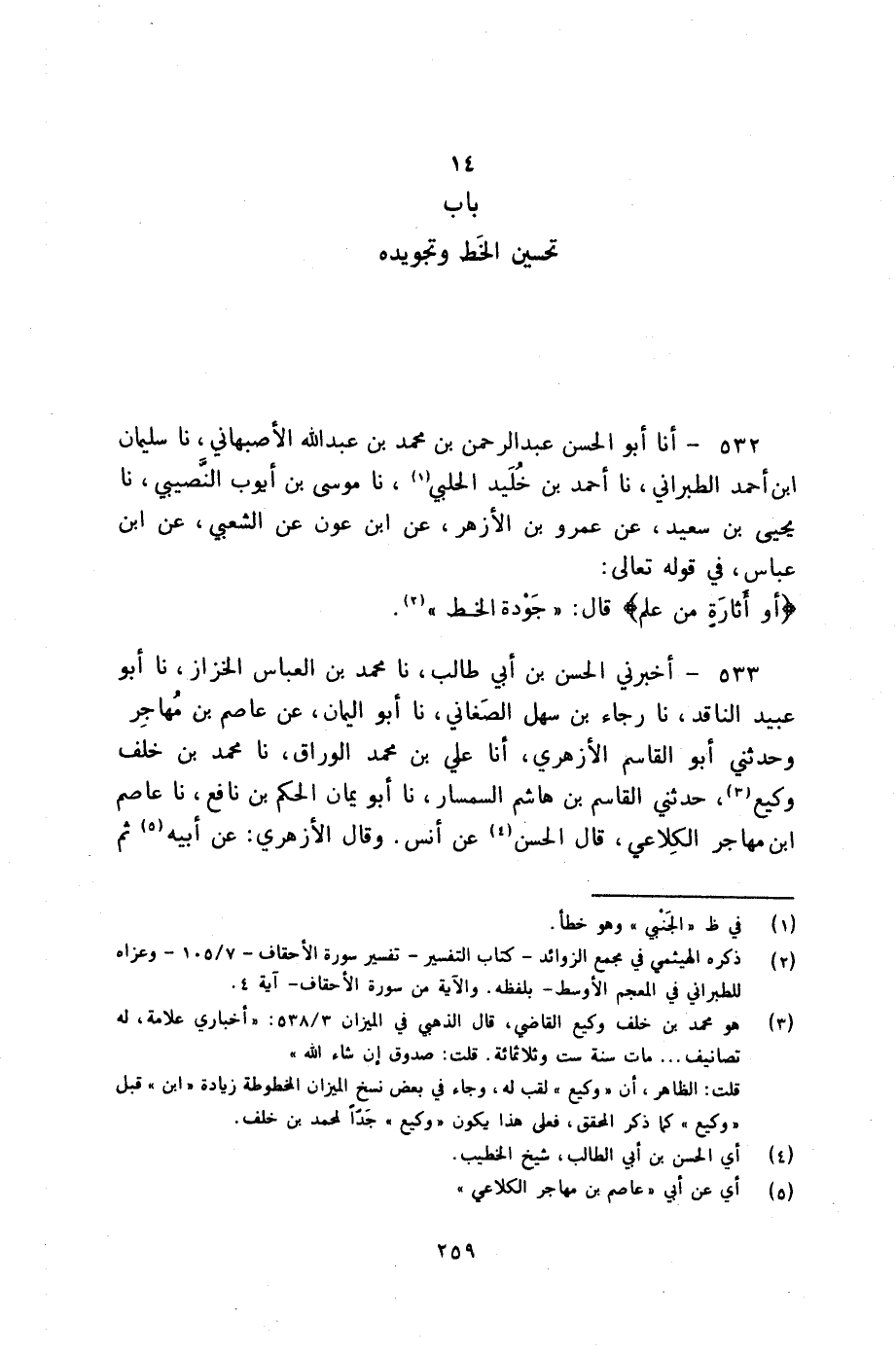 532 - أنا أَبُو الْحَسَنِ عَبْدُ الرَّحْمَنِ بْنُ مُحَمَّدِ بْنِ عَبْدِ اللَّهِ الْأَصْبَهَانِيُّ، نا سُلَيْمَانُ بْنُ أَحْمَدَ الطَّبَرَانِيُّ، نا أَحْمَدُ بْنُ خُلَيْدٍ الْحَلَبِيُّ، نا مُوسَى بْنُ أَيُّوبَ النَّصِيبِيُّ، نا يَحْيَى بْنُ سَعِيدٍ، عَنْ عَمْرِو بْنِ الْأَزْهَرِ، عَنِ ابْنِ عَوْنٍ، عَنِ الشَّعْبِيِّ، عَنِ ابْنِ عَبَّاسٍ، فِي قَوْلِهِ تَعَالَى: " {§أَوْ أَثَارَةٍ مِنْ عِلْمٍ} [الأحقاف: 4] قَالَ: «جَوْدَةُ الْخَطِّ»