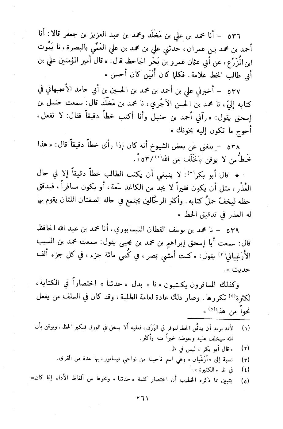 539 - نا مُحَمَّدُ بْنُ يُوسُفَ الْقَطَّانُ النَّيْسَابُورِيُّ، أنا مُحَمَّدُ بْنُ عَبْدِ اللَّهِ الْحَافِظُ، قَالَ: سَمِعْتُ أَبَا إِسْحَاقَ إِبْرَاهِيمَ بْنَ مُحَمَّدِ بْنِ يَحْيَى، يَقُولُ: سَمِعْتُ مُحَمَّدَ بْنَ الْمُسَيَّبِ الْأَرْغِيَانِيَّ، يَقُولُ: «§كُنْتُ أَمْشِي بِمِصْرَ فِي كُمِّي مِائَةُ جُزْءٍ، فِي كُلِّ جُزْءٍ أَلْفُ حَدِيثٍ» وَكَذَلِكَ الْمُسَافِرُونَ يَكْتُبُونَ «نا» بَدَلَ «حَدَّثَنَا» اخْتِصَارًا فِي الْكِتَابَةِ لِكَثْرَةِ تَكَرُّرِهَا، وَصَارَ ذَلِكَ عَادَةً لِعَامَّةِ الطَّلَبَةِ، وَقَدْ كَانَ فِي السَّلَفِ مَنْ يَفْعَلُ نَحْوًا مِنْ هَذَا