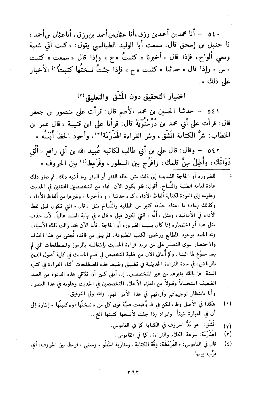 541 - حَدَّثَنَا الْحُسَيْنُ بْنُ مُحَمَّدِ الْأَصَمُّ، قَالَ: قَرَأْتُ عَلَى مَنْصُورِ بْنِ جَعْفَرٍ، قَالَ: قَرَأْتُ عَلَى أَبِي مُحَمَّدِ بْنِ دُرُسْتَوَيْهِ، قَالَ: قَرَأْنَا عَلَى ابْنِ قُتَيْبَةَ، قَالَ عُمَرُ بْنُ الْخَطَّابِ: «§شَرُّ الْكِتَابَةِ الْمَشْقُ، وَشَرُّ الْقِرَاءَةِ الْهَذْرَمَةُ، وَأَجْوَدُ الْخَطِّ أَبْيَنُهُ»