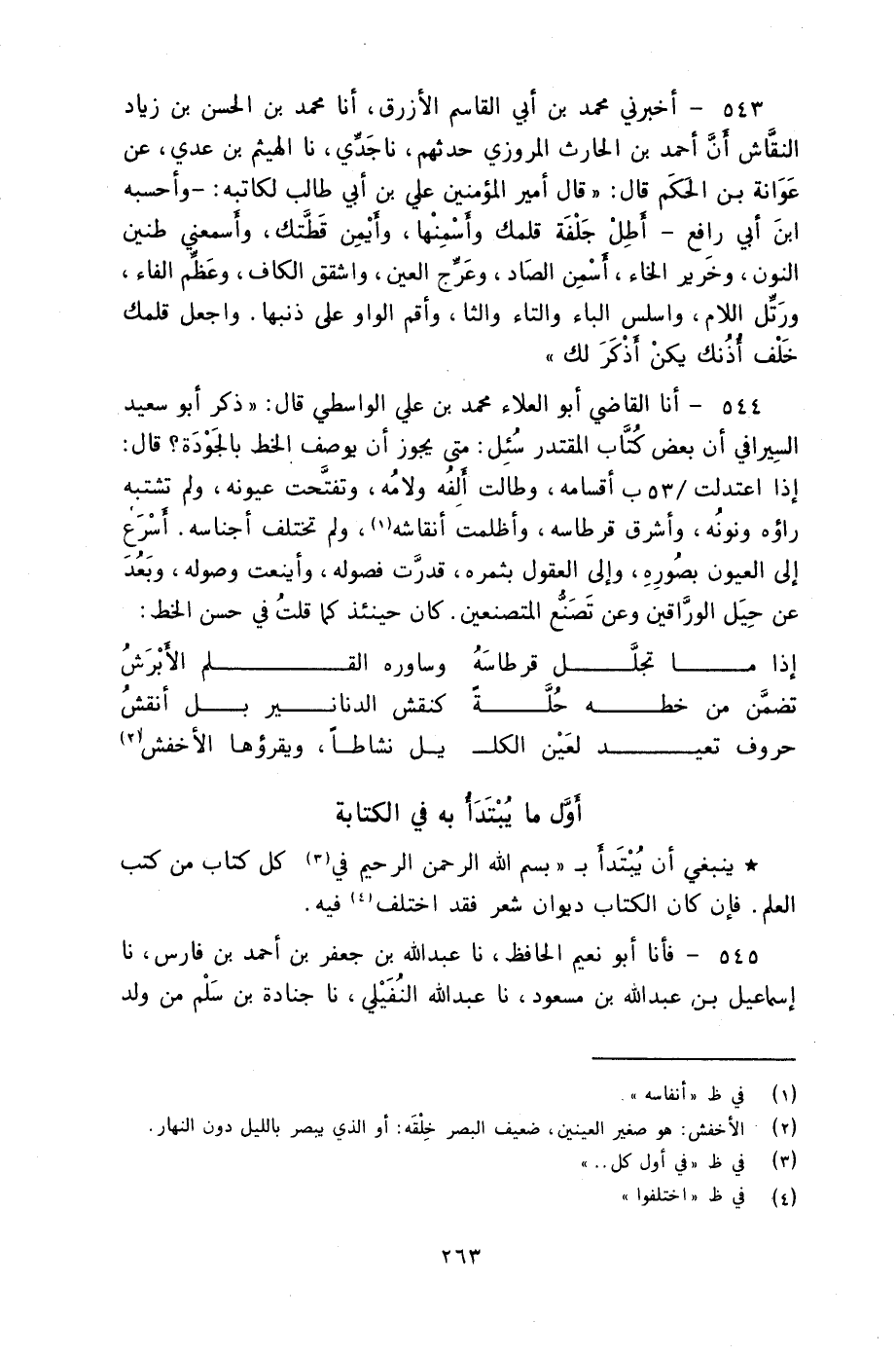 543 - أَخْبَرَنِي مُحَمَّدُ بْنُ أَبِي الْقَاسِمِ الْأَزْرَقُ، أنا مُحَمَّدُ بْنُ الْحَسَنِ بْنِ زِيَادٍ النَّقَّاشُ، أَنَّ أَحْمَدَ بْنَ الْحَارِثِ الْمَرْوَزِيَّ، حَدَّثَهُمْ، نا جَدِّي، نا الْهَيْثَمُ بْنُ عَدِيٍّ، عَنْ عَوَانَةَ بْنِ الْحَكَمِ، قَالَ: قَالَ أَمِيرُ الْمُؤْمِنِينَ عَلِيُّ بْنُ أَبِي طَالِبٍ لِكَاتِبِهِ وَأَحْسَبُهُ ابْنَ أَبِي رَافِعٍ: «§أَطِلْ جَلْفَةَ قَلَمِكَ وَأَسْمِنْهَا، وَأَيْمِنْ قِطَّتَكَ، وَأَسمِعْنِي طَنِينَ النُّونِ وَخَرِيرَ الْخَاءِ، أَسْمِنِ الصَّادَ، وَعَرِّجِ الْعَيْنَ، وَاشْقُقِ الْكَافَ، وَعَظِّمِ الْفَاءَ، وَرَتِّلِ اللَّامَ، وَاسْلِسِ الْبَاءَ وَالتَّاءَ وَالثَّا، وَأَقِمِ الْوَاوَ عَلَى ذَنَبِهَا، وَاجْعَلْ قَلَمَكَ خَلْفَ أُذُنِكَ يَكُنْ أَذْكَرَ لَكَ»