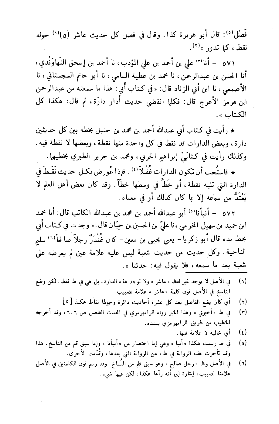 571 - أنا عَلِيُّ بْنُ أَحْمَدَ بْنِ عَلِيٍّ الْمُؤَدِّبُ، نا أَحْمَدُ بْنُ إِسْحَاقَ النَّهَاوَنْدِيُّ، أنا الْحَسَنُ بْنُ عَبْدِ الرَّحْمَنِ، نا مُحَمَّدُ بْنُ عَطِيَّةَ السَّامِيُّ، نا أَبُو حَاتِمٍ السِّجِسْتَانِيُّ، نا الْأَصْمَعِيُّ، نا ابْنُ أَبِي الزِّنَادِ، قَالَ: " §فِي كِتَابِ أَبِي: هَذَا مَا سَمِعْتُهُ مِنْ عَبْدِ الرَّحْمَنِ ابْنِ هُرْمُزَ الْأَعْرَجِ، قَالَ: فَكُلَّمَا انْقَضَى حَدِيثٌ أَدَارَ دَارَةً، ثُمَّ قَالَ: هَكَذَا كُلُّ الْكِتَابِ " رَأَيْتُ فِيَ كِتَابِ أَبِي عَبْدِ اللَّهِ أَحْمَدَ بْنِ مُحَمَّدِ بْنِ حَنْبَلٍ بِخَطِّهِ بَيْنَ كُلِّ حَدِيثَيْنِ دَارَةٌ، وَبَعْضُ الدَّارَاتِ قَدْ نُقِطَ فِي كُلِّ وَاحِدَةٍ مِنْهَا نُقْطَةٌ، وَبَعْضُهَا لَا نُقْطَةَ فِيهِ، وَكَذَلِكَ رَأَيْتُ فِيَ كِتَابَيْ: إِبْرَاهِيمَ الْحَرْبِيِّ، وَمُحَمَّدِ بْنِ جَرِيرٍ الطَّبَرِيِّ بِخَطَّيْهِمَا، فَاسْتُحِبَّ أَنْ تَكُونَ الدَّارَاتُ غُفْلًا، فَإِذَا عُورِضَ بِكُلِّ حَدِيثٍ نَقَطَ فِي الدَّارَةِ الَّتِي تَلِيهِ نُقْطَةً، أَوْ خَطَّ فِي وَسَطِهَا خَطًّا، وَقَدْ كَانَ بَعْضُ أَهْلِ الْعِلْمِ لَا يَعْتَدُّ مِنْ سَمَاعِهِ إِلَّا بِمَا كَانَ كَذَلِكَ أَوْ فِي مَعْنَاهُ