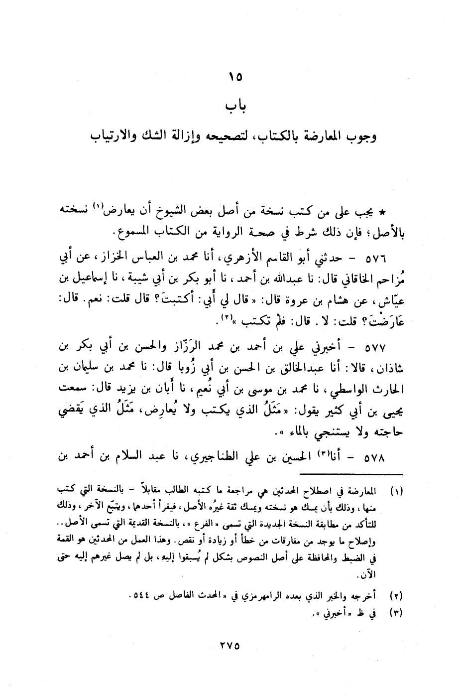 §بَابُ وُجُوبِ الْمُعَارَضَةِ بِالْكِتَابِ لِتَصْحِيحِهِ وَإِزَالَةِ الشَّكِّ وَالِارْتِيَابِ يَجِبُ عَلَى مَنْ كَتَبَ نُسْخَةً مِنْ أَصْلِ بَعْضِ الشُّيُوخِ أَنْ يُعَارِضَ نُسْخَتَهُ بِالْأَصْلِ، فَإِنَّ ذَلِكَ شَرْطٌ فِي صِحَّةِ الرِّوَايَةِ مِنَ الْكِتَابِ الْمَسْمُوعِ