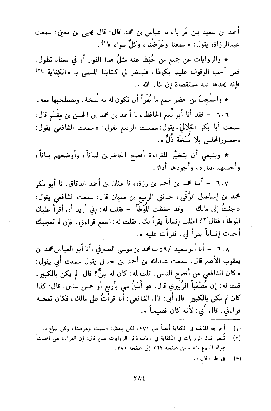 606 - فَقَدْ أنا أَبُو نُعَيْمٍ الْحَافِظُ، نا أَحْمَدُ بْنُ مُحَمَّدِ بْنِ الْحَسَنِ بْنِ مِقْسَمٍ، قَالَ: سَمِعْتُ أَبَا بَكْرٍ الْخِلَالِيَّ، يَقُولُ: سَمِعْتُ الرَّبِيعَ، يَقُولُ: سَمِعْتُ الشَّافِعِيَّ، يَقُولُ: §«حُضُورُ الْمَجْلِسِ بِلَا نُسْخَةٍ ذُلٌّ» وَيَنْبَغِي أَنْ يَتَخَيَّرَ لِلْقِرَاءَةِ أَفْصَحَ الْحَاضِرِينَ لِسَانًا، وَأَوْضَحَهُمْ بَيَانًا، وَأَحْسَنَهُمْ عِبَارَةً، وَأَجْوَدَهُمْ أَدَاءً