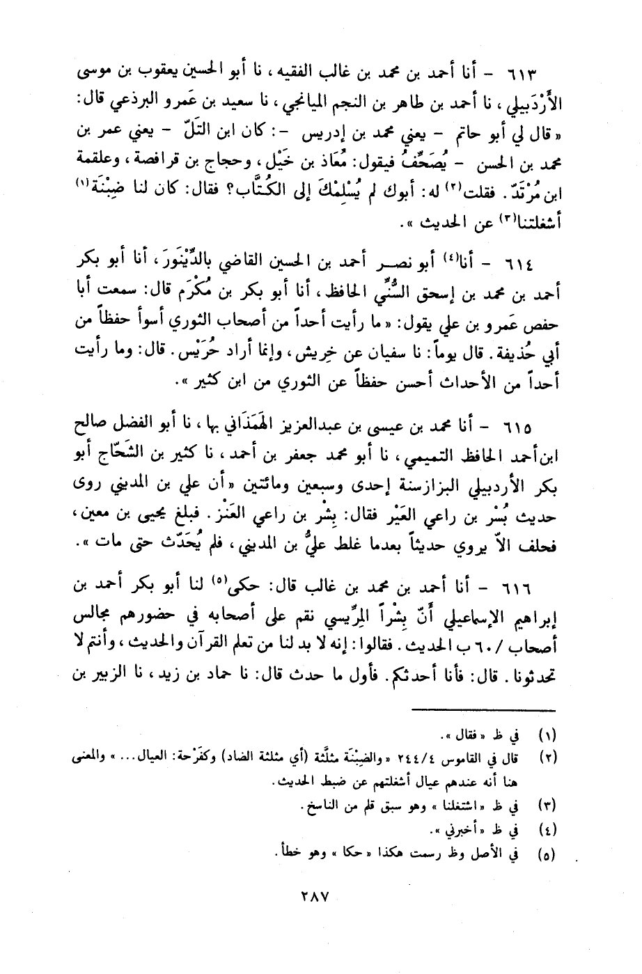 613 - أنا أَحْمَدُ بْنُ مُحَمَّدِ بْنِ غَالِبٍ الْفَقِيهُ، نا أَبُو الْحُسَيْنِ يَعْقُوبُ بْنُ مُوسَى الْأَرْدُبِيلِيُّ، نا أَحْمَدُ بْنُ طَاهِرِ بْنِ النَّجْمِ الْمَيَانَجِيُّ، نا سَعِيدُ بْنُ عَمْرٍو الْبَرْذَعِيُّ، قَالَ، قَالَ لِي أَبُو حَاتِمٍ، يَعْنِي مُحَمَّدَ بْنَ إِدْرِيسَ " §كَانَ ابْنُ التَّلِّ، يَعْنِي عُمَرَ بْنَ مُحَمَّدِ بْنِ الْحَسَنِ، يُصَحِّفُ فَيَقُولُ: مُعَاذُ بْنُ خَيْلٍ، وَحَجَّاجُ بْنُ قَرَافِصَةَ، وَعَلْقَمَةُ بْنُ مُرْتَدٍّ، فَقُلْتُ لَهُ: أَبُوكَ لَمْ يُسَلِّمْكَ إِلَى الْكُتَّابِ؟ فَقَالَ: «كَانَ لَنَا ضِبْنَةٌ أَشْغَلَتْنَا عَنِ الْحَدِيثِ»