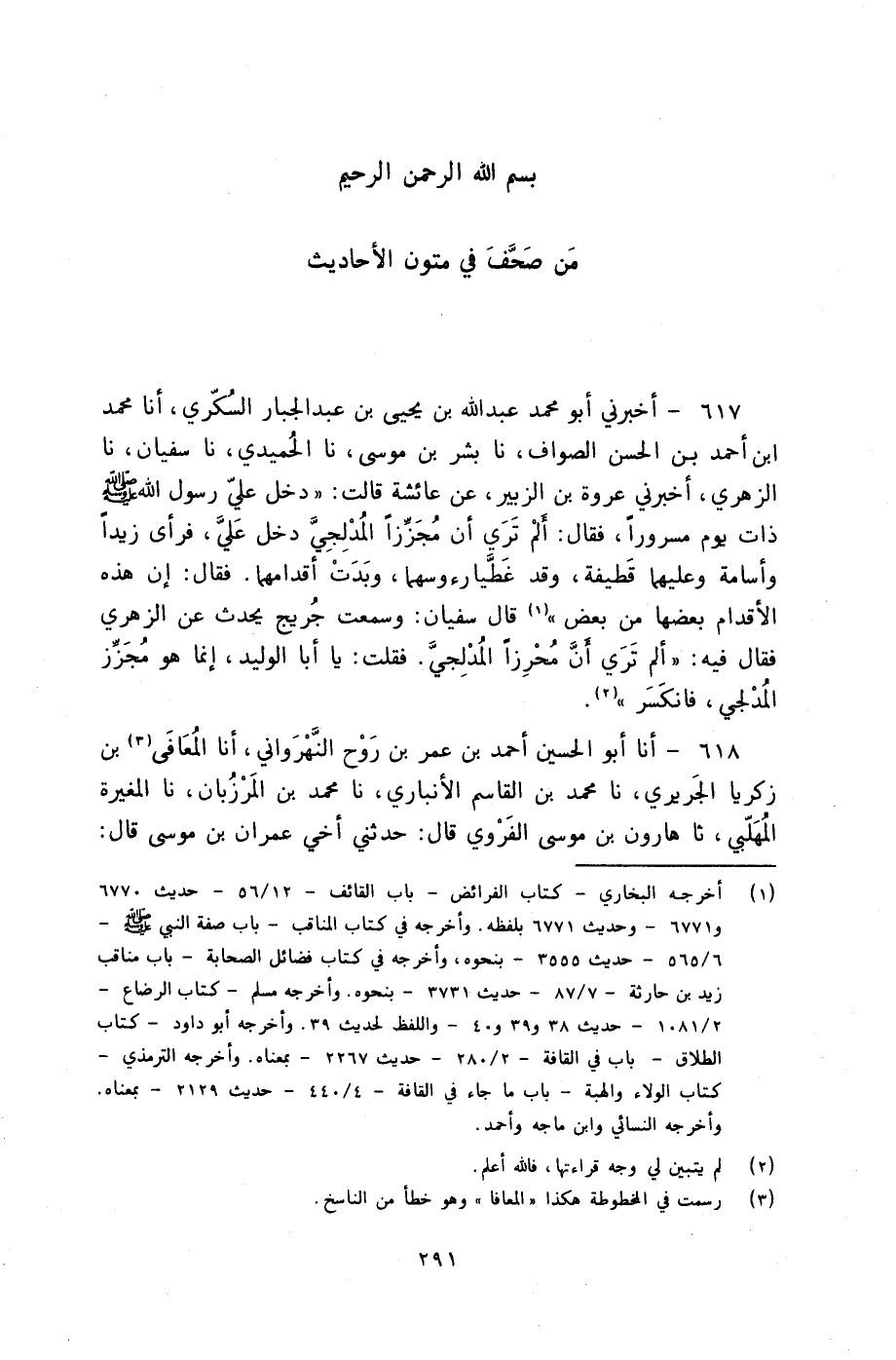 617 - أَخْبَرَنِي أَبُو مُحَمَّدٍ عَبْدُ اللَّهِ بْنُ يَحْيَى بْنِ عَبْدِ الْجَبَّارِ السُّكَّرِيُّ، أنا مُحَمَّدُ بْنُ أَحْمَدَ بْنِ الْحَسَنِ الصَّوَّافُ، نا بِشْرُ بْنُ مُوسَى، نا الْحُمَيْدِيُّ، نا سُفْيَانُ، نا الزُّهْرِيُّ، أَخْبَرَنِي عُرْوَةُ بْنُ الزُّبَيْرِ، عَنْ عَائِشَةَ، قَالَتْ: دَخَلَ عَلَيَّ رَسُولُ اللَّهِ صَلَّى اللهُ عَلَيْهِ وَسَلَّمَ ذَاتَ يَوْمٍ مَسْرُورًا، فَقَالَ: §" أَلَمْ تَرَيْ أَنَّ مُجَزِّزًا الْمُدْلِجِيَّ دَخَلَ عَلَيَّ فَرَأَى زَيْدًا وَأُسَامَةَ وَعَلَيْهِمَا قَطِيفَةٌ وَقَدْ غَطَّيَا رُءُوسَهُمَا وَبَدَتْ أَقْدَامُهُمَا، فَقَالَ: إِنَّ هَذِهِ الْأَقْدَامَ بَعْضُهَا مِنْ بَعْضٍ؟ " قَالَ سُفْيَانُ: وَسَمِعْتُ جُرَيْجًا يُحَدِّثُ عَنِ الزُّهْرِيِّ فَقَالَ فِيهِ: " أَلَمْ تَرَيْ أَنَّ مُحَرِّزًا الْمُدْلِجِيَّ، قُلْتُ: يَا أَبَا الْوَلِيدِ، إِنَّمَا هُوَ مُجَزِّزٌ الْمُدْلِجِيُّ، فَانْكَسَرَ "