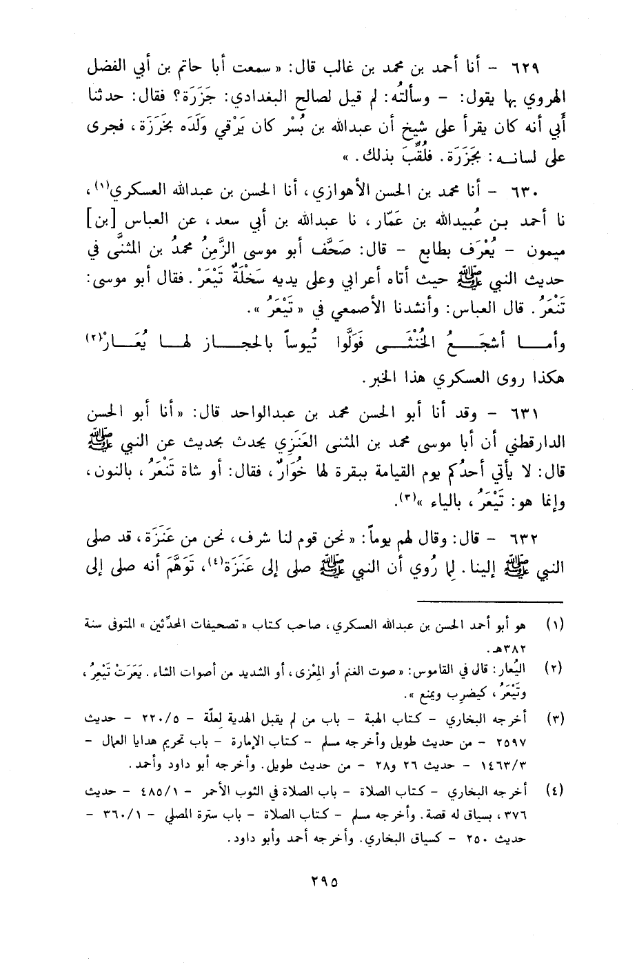 630 - أنا مُحَمَّدُ بْنُ الْحَسَنِ الْأَهْوَازِيُّ، أنا الْحَسَنُ بْنُ عَبْدِ اللَّهِ الْعَسْكَرِيُّ، نا أَحْمَدُ بْنُ عُبَيْدِ اللَّهِ بْنِ عَمَّارٍ، نا عَبْدُ اللَّهِ بْنُ أَبِي سَعْدٍ، عَنِ الْعَبَّاسِ بْنِ مَيْمُونٍ، يُعْرَفُ بِطَابَعٍ قَالَ: §«صَحَّفَ أَبُو مُوسَى الزَّمِنُ مُحَمَّدُ بْنُ الْمُثَنَّى فِي حَدِيثِ النَّبِيِّ صَلَّى اللهُ عَلَيْهِ وَسَلَّمَ حَيْثُ» أَتَاهُ أَعْرَابِيٌّ وَعَلَى يَدَيْهِ سَخْلَةٌ تَيْعَرُ"، فَقَالَ: أَبُو مُوسَى: تَنْعَرُ، قَالَ الْعَبَّاسُ: وَأَنْشَدَنَا الْأَصْمَعِيُّ فِي تَيْعَرُ: