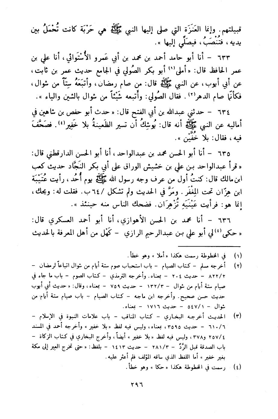 633 - أنا أَبُو حَامِدٍ أَحْمَدُ بْنُ مُحَمَّدِ بْنِ أَبِي عَمْرٍو الْأُسْتُوَائِيُّ، أنا عَلِيُّ بْنُ عُمَرَ الْحَافِظُ، قَالَ: أَمْلَى أَبُو بَكْرٍ الصُّولِيُّ فِي الْجَامِعِ حَدِيثَ عُمَرَ بْنِ ثَابِتٍ عَنْ أَبِي أَيُّوبَ، عَنِ النَّبِيِّ صَلَّى اللهُ عَلَيْهِ وَسَلَّمَ قَالَ: §«مَنْ صَامَ رَمَضَانَ وَأَتْبَعَهُ سِتًّا مِنْ شَوَّالٍ فَكَأَنَّمَا صَامَ الدَّهْرَ» ، فَقَالَ الصُّولِيُّ: وَأَتْبَعَهُ شَيْئًا مِنْ شَوَّالٍ بِالشِّينِ وَالْيَاءِ "