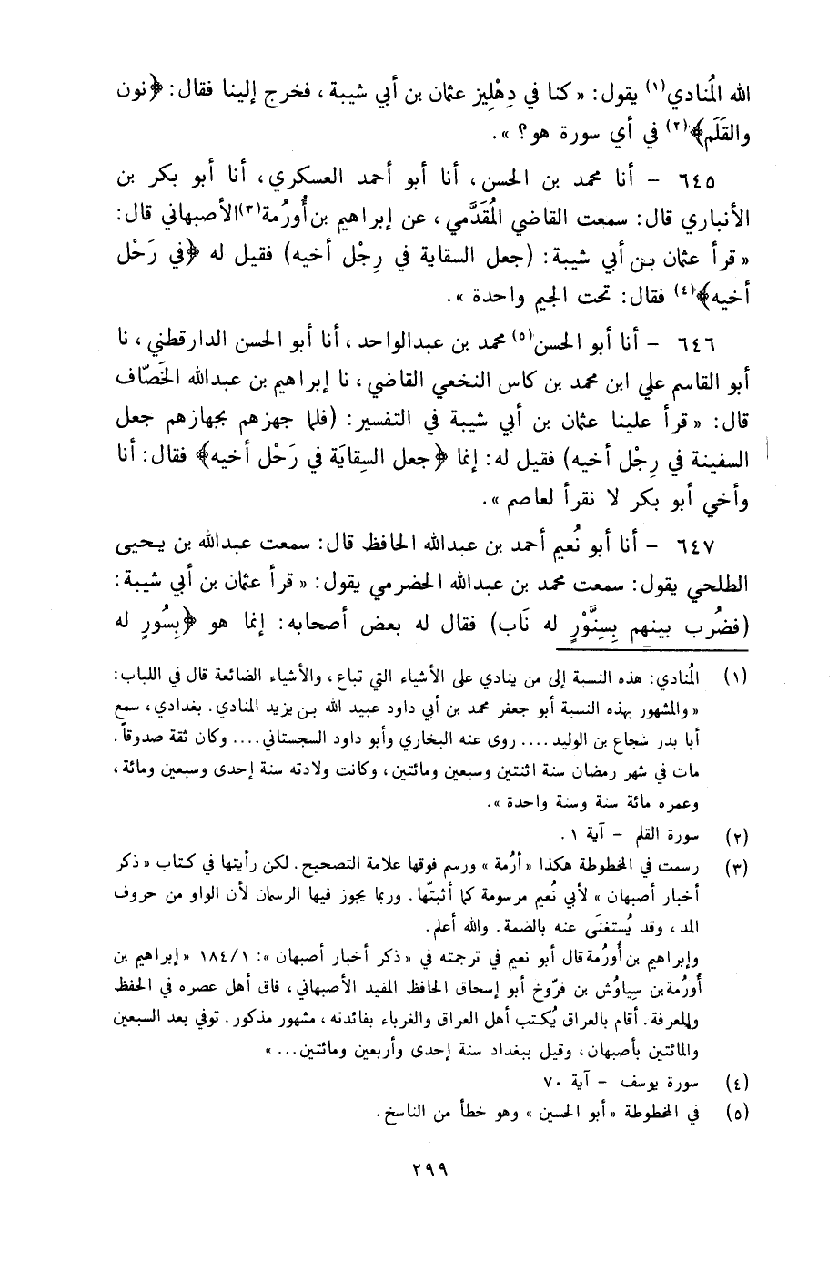 645 - أنا مُحَمَّدُ بْنُ الْحَسَنِ، أنا أَبُو أَحْمَدَ الْعَسْكَرِيُّ، أنا أَبُو بَكْرِ بْنُ الْأَنْبَارِيِّ، قَالَ: سَمِعْتُ الْقَاضِيَ الْمُقَدَّمِيَّ، عَنْ إِبْرَاهِيمَ بْنِ أُورُمَةَ الْأَصْبَهَانِيِّ، قَالَ: " قَرَأَ عُثْمَانُ بْنُ أَبِي شَيْبَةَ: " §جَعَلَ السِّقَايَةَ فِي رِجْلِ أَخِيهِ، فَقِيلَ لَهُ: {فِي رَحْلِ أَخِيهِ} [يوسف: 70] ، فَقَالَ: تَحْتَ الْجِيمِ وَاحِدَةٌ "