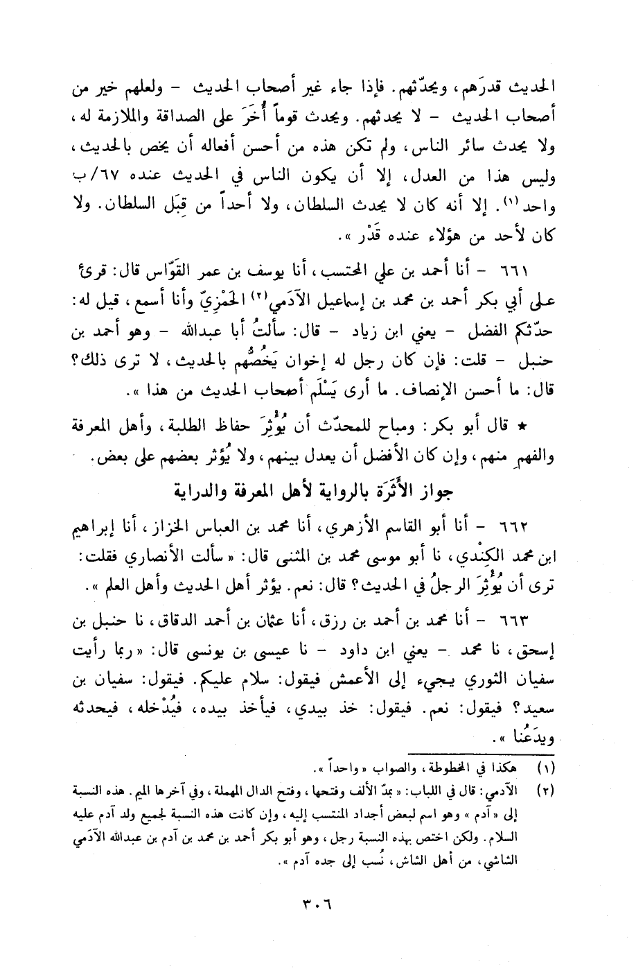 661 - أنا أَحْمَدُ بْنُ عَلِيٍّ الْمُحْتَسِبُ، أنا يُوسُفُ بْنُ عُمَرَ الْقَوَّاسُ، قَالَ: قُرِئَ عَلَى أَبِي بَكْرٍ أَحْمَدَ بْنِ مُحَمَّدِ بْنِ إِسْمَاعِيلَ الْآدَمِيِّ الْحَمْزِيِّ، وَأَنَا أَسْمَعُ، قِيلَ لَهُ: حَدَّثَكُمُ الْفَضْلُ، يَعْنِي ابْنَ زِيَادٍ، قَالَ: سَأَلْتُ أَبَا عَبْدِ اللَّهِ وَهُوَ أَحْمَدُ بْنُ حَنْبَلٍ قُلْتُ: " فَإِنْ كَانَ رَجُلٌ لَهُ إِخْوَانٌ يَخُصُّهُمْ بِالْحَدِيثِ لَا تَرَى ذَلِكَ؟ قَالَ: §«مَا أَحْسَنَ الْإِنْصَافَ مَا أَرَى يَسْلَمُ أَصْحَابُ الْحَدِيثِ مِنْ هَذَا» قَالَ أَبُو بَكْرٍ: وَمُبَاحٌ لِلْمُحَدِّثِ أَنْ يُؤْثِرَ حُفَّاظَ الطَّلَبَةِ وَأَهْلَ الْمَعْرِفَةِ وَالْفَهْمِ مِنْهُمْ، وَإِنْ كَانَ الْأَفْضَلُ أَنْ يَعْدِلَ بَيْنَهُمْ، وَلَا يُؤْثِرَ بَعْضَهُمْ عَلَى بَعْضٍ