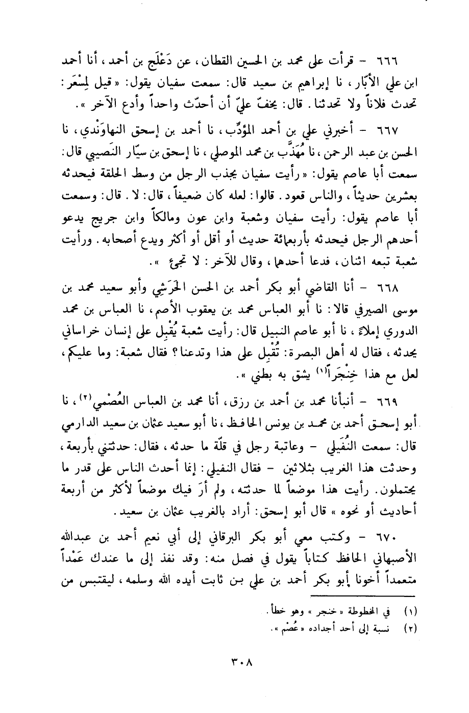 668 - أنا الْقَاضِي أَبُو بَكْرٍ أَحْمَدُ بْنُ الْحَسَنِ الْحَرَشِيُّ، وَأَبُو سَعِيدٍ مُحَمَّدُ بْنُ مُوسَى الصَّيْرَفِيُّ قَالَا: نا أَبُو الْعَبَّاسِ مُحَمَّدُ بْنُ يَعْقُوبَ الْأَصَمُّ، نا الْعَبَّاسُ بْنُ مُحَمَّدٍ الدُّورِيُّ، إِمْلَاءً، نا أَبُو عَاصِمٍ النَّبِيلُ، قَالَ: " رَأَيْتُ شُعْبَةَ يُقْبِلُ عَلَى إِنْسَانٍ خُرَاسَانِيٍّ يُحَدِّثُهُ، فَقَالَ لَهُ أَهْلُ الْبَصْرَةِ: تُقْبِلُ عَلَى هَذَا وَتَدَعُنَا؟ فَقَالَ شُعْبَةُ: «§وَمَا عَلَيْكُمْ، لَعَلَّ مَعَ هَذَا خِنْجَرًا يَشُقُّ بِهِ بَطْنِي»