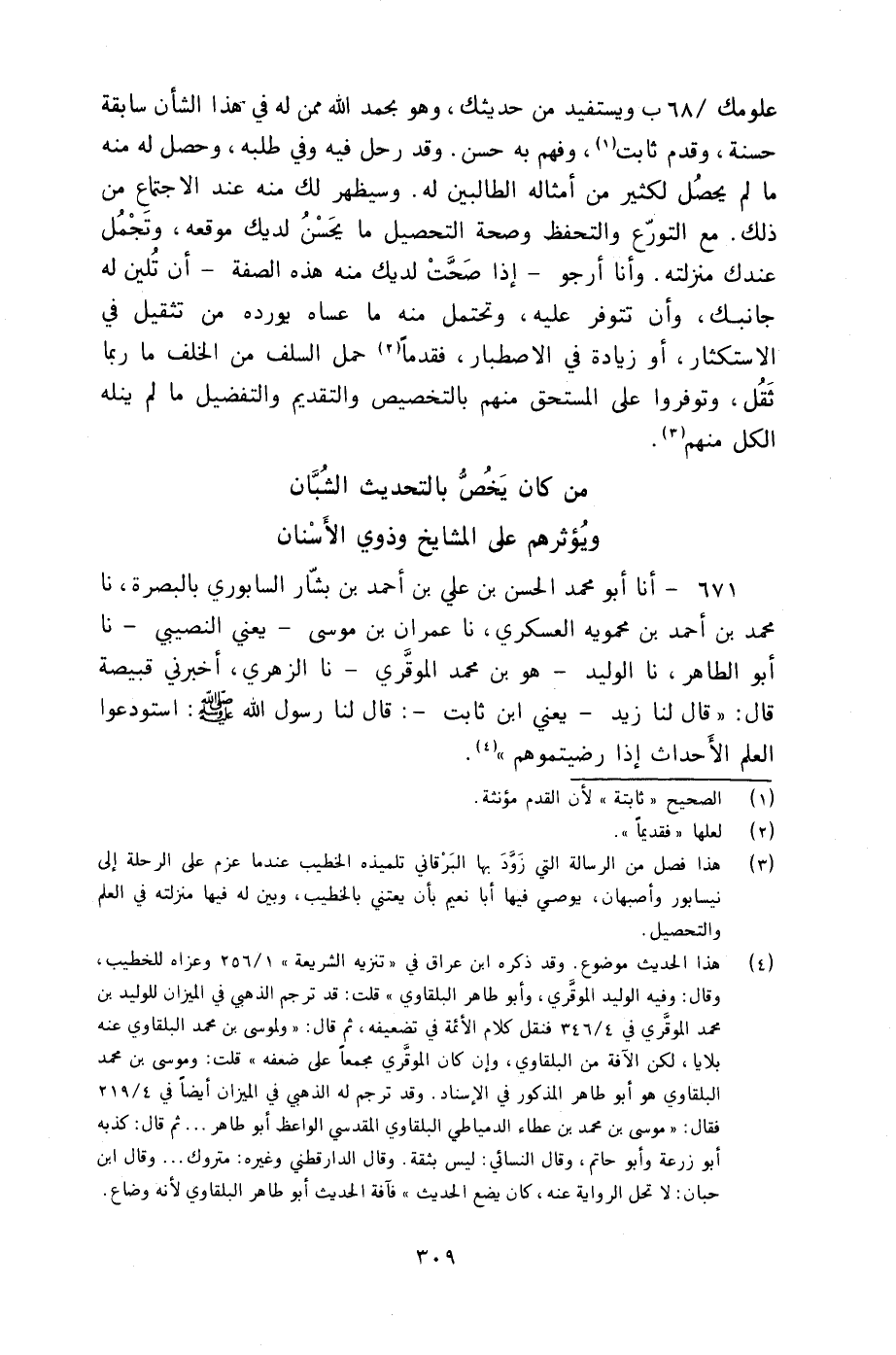 671 - أنا أَبُو مُحَمَّدٍ الْحَسَنُ بْنُ عَلِيِّ بْنِ أَحْمَدَ بْنِ بَشَّارٍ السَّابُورِيُّ، بِالْبَصْرَةِ، نا مُحَمَّدُ بْنُ أَحْمَدَ بْنِ مَحْمَوَيْهِ الْعَسْكَرِيُّ، نا عِمْرَانُ بْنُ مُوسَى، يَعْنِي النَّصِيبِيَّ، نا أَبُو الطَّاهِرِ، نا الْوَلِيدُ هُوَ بْنُ مُحَمَّدٍ الْمُوَقَّرِيُّ، نا الزُّهْرِيُّ، أَخْبَرَنِي قَبِيصَةُ، قَالَ: قَالَ لَنَا زَيْدٌ يَعْنِي ابْنَ ثَابِتٍ، قَالَ لَنَا رَسُولُ اللَّهِ صَلَّى اللهُ عَلَيْهِ وَسَلَّمَ: §«اسْتَوْدِعُوا الْعِلْمَ الْأَحْدَاثَ إِذَا رَضِيتُمُوهُمْ»