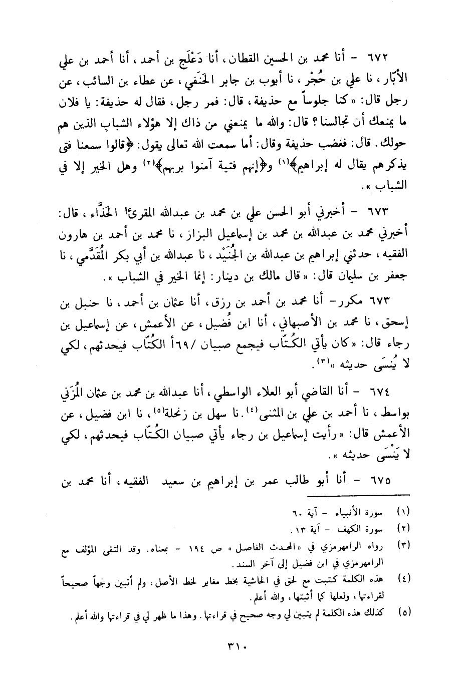 672 - أنا مُحَمَّدُ بْنُ الْحُسَيْنِ الْقَطَّانُ، أنا دَعْلَجُ بْنُ أَحْمَدَ، أنا أَحْمَدُ بْنُ عَلِيٍّ الْأَبَّارُ، نا عَلِيُّ بْنُ حُجْرٍ، نا أَيُّوبُ بْنُ جَابِرٍ الْحَنَفِيُّ، عَنْ عَطَاءِ بْنِ السَّائِبِ، عَنْ رَجُلٍ، قَالَ: " §كُنَّا جُلُوسًا مَعَ حُذَيْفَةَ قَالَ: فَمَرَّ رَجُلٌ فَقَالَ لَهُ حُذَيْفَةَ: " يَا فُلَانُ، مَا يَمْنَعُكَ أَنْ تُجَالِسَنَا؟ قَالَ: وَاللَّهِ مَا يَمْنَعُنِي مِنْ ذَاكَ إِلَّا هَؤُلَاءِ الشَّبَابُ الَّذِينَ هُمْ حَوْلَكَ، قَالَ: فَغَضِبَ حُذَيْفَةُ وَقَالَ: " أَمَا سَمِعْتَ اللَّهُ تَعَالَى يَقُولُ: {قَالُوا سَمِعْنَا فَتًى يَذْكُرُهُمْ يُقَالُ لَهُ إِبْرَاهِيمُ} [الأنبياء: 60] وَ {إِنَّهُمْ فِتْيَةٌ آمَنُوا بِرَبِّهِمْ} [الكهف: 13] وَهَلِ الْخَيْرُ إِلَّا فِي الشَّبَابِ "