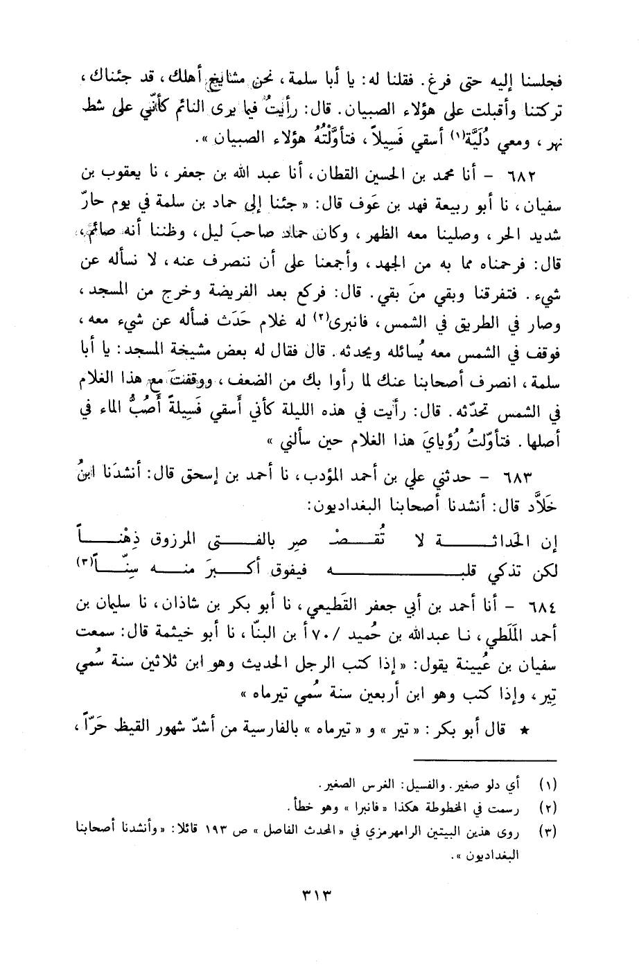 684 - أنا أَحْمَدُ بْنُ أَبِي جَعْفَرٍ الْقَطِيعِيُّ، نا أَبُو بَكْرِ بْنُ شَاذَانَ، نا سُلَيْمَانُ بْنُ أَحْمَدَ الْمَلَطِيُّ، نا عَبْدُ اللَّهِ بْنُ حُمَيْدِ بْنِ الْبَنَّا، نا أَبُو خَيْثَمَةَ، قَالَ: سَمِعْتُ سُفْيَانَ بْنَ عُيَيْنَةَ، يَقُولُ: §«إِذَا كَتَبَ الرَّجُلُ الْحَدِيثَ وَهُوَ ابْنُ ثَلَاثِينَ سَنَةً سُمِّيَ تير، وَإِذَا كَتَبَ وَهُوَ ابْنُ أَرْبَعِينَ سَنَةً سُمِّيَ تيرماه» قَالَ أَبُو بَكْرٍ: تير وَتيرماه بِالْفَارِسِيَّةِ مِنْ أَشَدِّ شُهُورِ الْقَيْظِ حَرًّا، وَأَثْقَلِهَا عَلَى الْقُلُوبِ كَرْبًا، وَأَرَادَ سُفْيَانُ بِذَلِكَ أَنَّ طَلَبَ الْحَدِيثِ فِي الْحَدَاثَةِ أَسْهَلُ مِنْ أَنْ يَتْرُكَهُ الْإِنْسَانُ حَتَّى يَتَكَامَلَ شَبَابُهُ، وَيَدْخُلَ فِي الْكُهُولَةِ، ثُمَّ يَبْتَدِئُ بِطَلَبِهِ فِي تِلْكَ الْحَالِ، فَيَكُونُ بِمَثَابَةِ تيرماه فِي الثِّقَلِ، وَاللَّهُ أَعْلَمُ