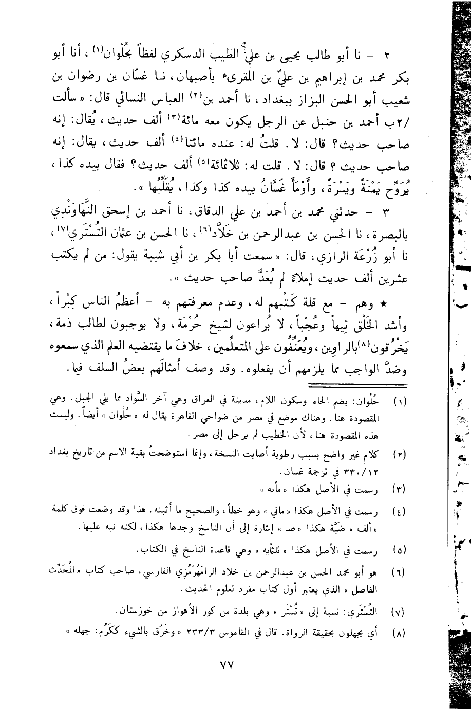 3 - حَدَّثَنِي مُحَمَّدُ بْنُ أَحْمَدَ بْنِ عَلِيٍّ الدَّقَّاقُ، نا أَحْمَدُ بْنُ إِسْحَاقَ النَّهَاوَنْدِيُّ، بِالْبَصْرَةِ، نا الْحَسَنُ بْنُ عَبْدِ الرَّحْمَنِ بْنِ خَلَّادٍ، نا الْحَسَنُ بْنُ عُثْمَانَ التُّسْتَرِيُّ، نا أَبُو زُرْعَةَ الرَّازِيُّ، قَالَ: سَمِعْتُ أَبَا بَكْرِ بْنِ أَبِي شَيْبَةَ، يَقُولُ: «§مَنْ لَمْ يَكْتُبْ عِشْرِينَ أَلْفَ حَدِيثٍ إِمْلَاءً، لَمْ يُعَدَّ صَاحِبَ حَدِيثٍ» وَهُمْ مَعَ قِلَّةِ كُتُبِهِمْ لَهُ، وَعَدَمِ مَعْرِفَتِهِمْ بِهِ أَعْظَمُ النَّاسِ كِبْرًا، وَأَشَدُّ الْخَلْقِ تِيهًا وَعُجْبًا، لَا يُرَاعُونَ لِشَيْخٍ حُرْمَةً، وَلَا يُوجِبُونَ لِطَالِبٍ ذِمَّةً، يَخْرِقُونَ بِالرَّاوِينَ، وَيُعَنِّفُونَ عَلَى الْمُتَعَلِّمِينَ، خِلَافَ مَا يَقْتَضِيهِ الْعِلْمُ الَّذِي سَمِعُوهُ، وَضِدَّ الْوَاجِبِ مِمَّا يَلْزَمُهُمْ أَنْ يَفْعَلُوهُ، وَقَدْ وَصَفَ أَمْثَالَهُمْ بَعْضُ السَّلَفِ فِيمَا