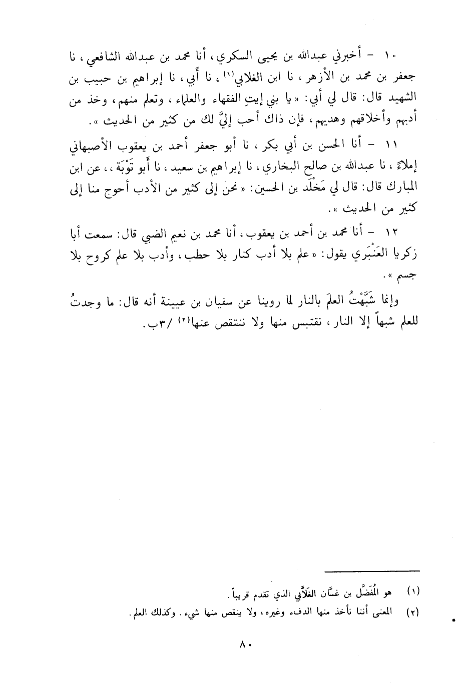 12 - أنا مُحَمَّدُ بْنُ أَحْمَدَ بْنِ يَعْقُوبَ، أنا مُحَمَّدُ بْنُ نُعَيْمٍ الضَّبِّيُّ، قَالَ: سَمِعْتُ أَبَا زَكَرِيَّا الْعَنْبَرِيَّ، يَقُولُ: " §عِلْمٌ بِلَا أَدَبٍ كَنَارٍ بِلَا حَطَبٍ، وَأَدَبٌ بِلَا عِلْمٍ كَرُوحٍ بِلَا جِسْمٍ، وَإِنَّمَا شَبَّهْتُ الْعِلْمَ بِالنَّارِ لِمَا رُوِّينَا عَنْ سُفْيَانَ بْنِ عُيَيْنَةَ أَنَّهُ قَالَ: مَا وَجَدْتُ لِلْعِلْمِ شَبَهًا إِلَّا النَّارَ، نَقْتَبِسُ مِنْهَا وَلَا نَنْتَقِصُ عَنْهَا "
