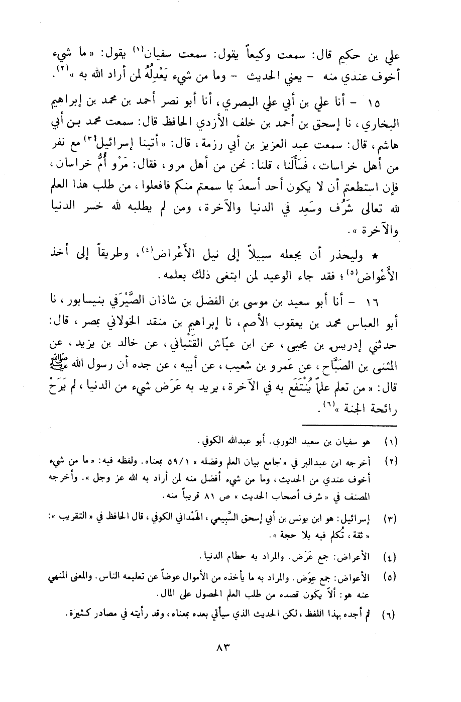 15 - أنا عَلِيُّ بْنُ أَبِي عَلِيٍّ الْبَصْرِيُّ، أنا أَبُو نَصْرٍ أَحْمَدُ بْنُ مُحَمَّدِ بْنِ إِبْرَاهِيمَ الْبُخَارِيُّ، نا إِسْحَاقُ بْنُ أَحْمَدَ بْنِ خَلَفٍ الْأَزْدِيُّ الْحَافِظُ، قَالَ: سَمِعْتُ مُحَمَّدَ بْنَ أَبِي هَاشِمٍ، قَالَ: سَمِعْتُ عَبْدَ الْعَزِيزِ بْنَ أَبِي رِزْمَةَ، قَالَ: أَتَيْنَا إِسْرَائِيلَ مَعَ نَفَرٍ مِنْ أَهْلِ خُرَاسَانَ، فَسَأَلَنَا، قُلْنَا: نَحْنُ مِنْ أَهْلِ مَرْوَ، فَقَالَ: §«مَرْوٌ أُمُّ خُرَاسَانَ؟ فَإِنِ اسْتَطَعْتُمْ أَنْ لَا يَكُونَ أَحَدٌ أَسْعَدَ بِمَا سَمِعْتُمْ مِنْكُمْ فَافْعَلُوا، مَنْ طَلَبَ هَذَا الْعِلْمَ لِلَّهِ تَعَالَى شَرُفَ وَسَعِدَ فِي الدُّنْيَا وَالْآخِرَةِ، وَمَنْ لَمْ يَطْلُبْهُ لِلَّهِ خَسِرَ الدُّنْيَا وَالْآخِرَةَ» وَلْيَحْذَرْ أَنْ يَجْعَلَهُ سَبِيلًا إِلَى نَيْلِ الْأَعْرَاضِ، وَطَرِيقًا إِلَى أَخْذِ الْأَعْوَاضِ، فَقَدْ جَاءَ الْوَعِيدُ لِمَنِ ابْتَغَى ذَلِكَ بِعِلْمِهِ