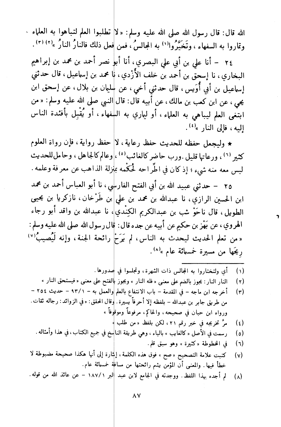 25 - حَدَّثَنِي عُبَيْدُ اللَّهِ بْنُ أَبِي الْفَتْحِ الْفَارِسِيُّ، نا أَبُو الْعَبَّاسِ أَحْمَدُ بْنُ مُحَمَّدِ بْنِ الْحُسَيْنِ الرَّازِيُّ، نا عَبْدُ اللَّهِ بْنُ مُحَمَّدِ بْنِ عَلِيِّ بْنِ طَرْخَانَ، نا زَكَرِيَّا بْنُ يَحْيَى الطَّوِيلُ، قَالَ: نا حَوْشَبُ بْنُ عَبْدِ الْكَرِيمِ الْكِنْدِيُّ، نا عَبْدُ اللَّهِ بْنُ وَاقِدٍ أَبُو رَجَاءٍ الْهَرَوِيُّ، عَنْ بَهْزِ بْنِ حَكِيمٍ، عَنْ أَبِيهِ، عَنْ جَدِّهِ، قَالَ: قَالَ رَسُولُ اللَّهِ صَلَّى اللهُ عَلَيْهِ وَسَلَّمَ: §«مَنْ تَعَلَّمَ الْحَدِيثَ لَيُحَدِّثَ بِهِ النَّاسَ لَمْ يَرَحْ رَائِحَةَ الْجَنَّةِ، وَإِنَّهُ لَيُصِيبُ رِيحَهَا مِنْ مَسِيرَةِ خَمْسِمِائَةِ عَامٍ»