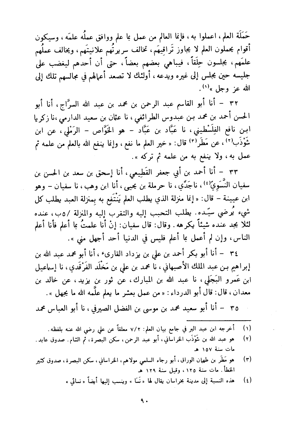 33 - أنا أَحْمَدُ بْنُ أَبِي جَعْفَرٍ الْقَطِيعِيُّ، أنا إِسْحَاقُ بْنُ سَعْدِ بْنِ الْحَسَنِ بْنِ سُفْيَانَ النَّسَوِيُّ، نا جَدِّي، نا حَرْمَلَةُ بْنُ يَحْيَى، أنا ابْنُ وَهْبٍ، نا سُفْيَانُ وَهُوَ ابْنُ عُيَيْنَةَ، قَالَ: §«إِنَّمَا مَنْزِلَةُ الَّذِي يَطْلُبُ الْعِلْمَ يَنْتَفِعُ بِهِ بِمَنْزِلَةِ الْعَبْدِ يَطْلُبُ كُلَّ شَيْءٍ يُرْضِي سَيِّدَهُ، يَطْلُبُ التَّحَبُّبَ إِلَيْهِ، وَالتَّقَرُّبَ إِلَيْهِ وَالْمَنْزِلَةَ عِنْدَهُ؛ لِئَلَّا يَجِدَ عِنْدَهُ شَيْئًا يَكْرَهُهُ»