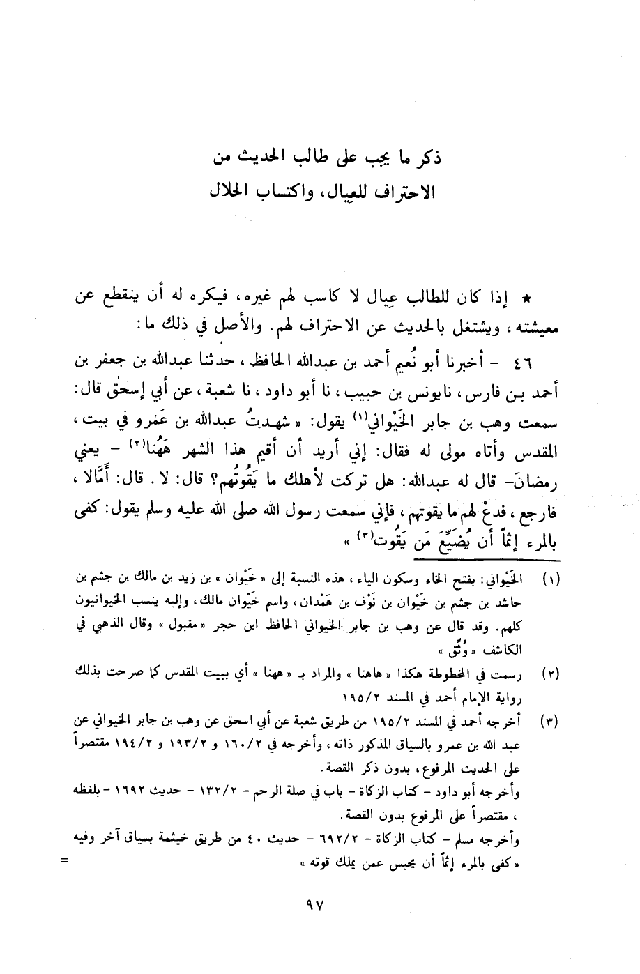 46 - أَخْبَرَنَا أَبُو نُعَيْمٍ أَحْمَدُ بْنُ عَبْدِ اللَّهِ الْحَافِظُ، حَدَّثَنَا عَبْدُ اللَّهِ بْنُ جَعْفَرِ بْنِ أَحْمَدَ بْنِ فَارِسٍ، نا يُونُسُ بْنُ حَبِيبٍ، نا أَبُو دَاوُدَ، نا شُعْبَةُ، عَنْ أَبِي إِسْحَاقَ، قَالَ: سَمِعْتُ وَهْبَ بْنَ جَابِرٍ الْخَيْوَانِيَّ، يَقُولُ: شَهِدْتُ عَبْدَ اللَّهِ بْنَ عَمْرٍو فِي بَيْتِ الْمَقْدِسِ، وَأَتَاهُ مَوْلًى لَهُ، فَقَالَ: إِنِّي أُرِيدُ أَنْ أُقِيمَ هَذَا الشَّهْرَ هَهُنَا - يَعْنِي رَمَضَانَ - قَالَ لَهُ عَبْدُ اللَّهِ: هَلْ تَرَكْتَ لِأَهْلِكَ مَا يَقُوتُهُمْ؟ قَالَ: لَا، قَالَ: أَمَّا لَا فَارْجِعْ فَدَعْ لَهُمْ مَا يَقُوتُهُمْ، فَإِنِّي سَمِعْتُ رَسُولَ اللَّهِ صَلَّى اللهُ عَلَيْهِ وَسَلَّمَ يَقُولُ: §«كَفَى بِالْمَرْءِ إِثْمًا أَنْ يُضَيِّعَ مَنْ يَقُوتُ»